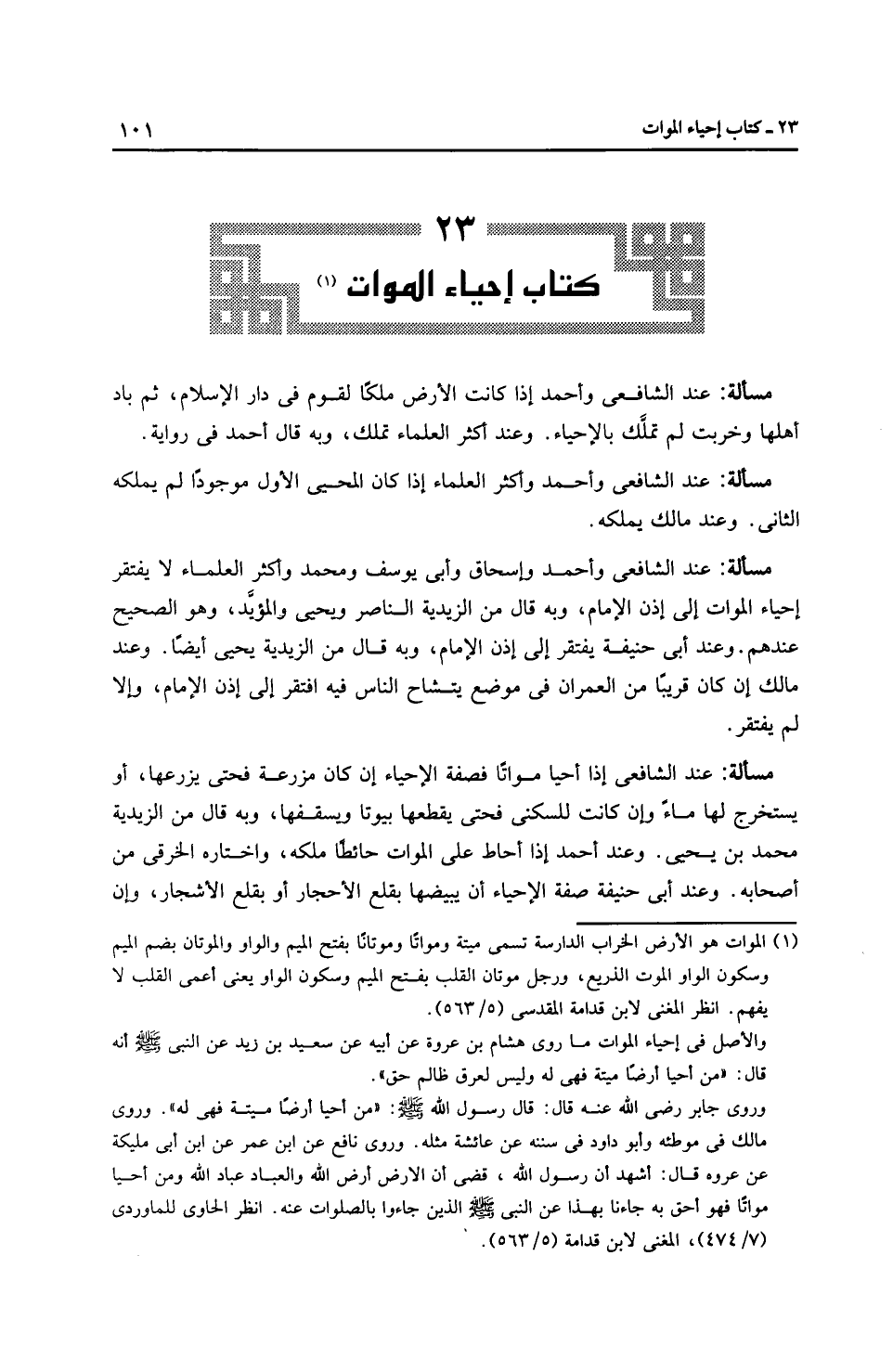 مَسْأَلَةٌ: عِنْدَ الشَّافِعِيِّ وَأَحْمَدَ إذا كانت الأرض ملكًا لقوم في دار الْإِسْلَام، ثم باد أهلها وخربت لم تملَّك بالإحياء. وعند أَكْثَر الْعُلَمَاءِ تملك، وبه قال أَحْمَد في رِوَايَة.