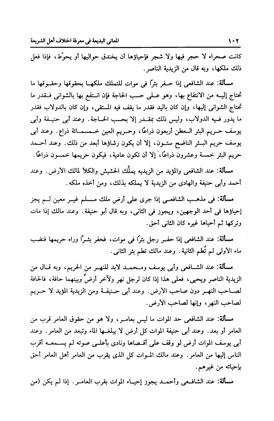 مَسْأَلَةٌ: فِي مَذْهَبِ الشَّافِعِيِّ إذا جرى على أرض ملك مسلم غير معين لم يجز إحياؤها في أحد الوجهين، ويجوز في الثاني، وبه قال أبو حَنِيفَةَ. وعند مالك إذا مات وتركها ثم أحياها غيره كان الثاني أحق.