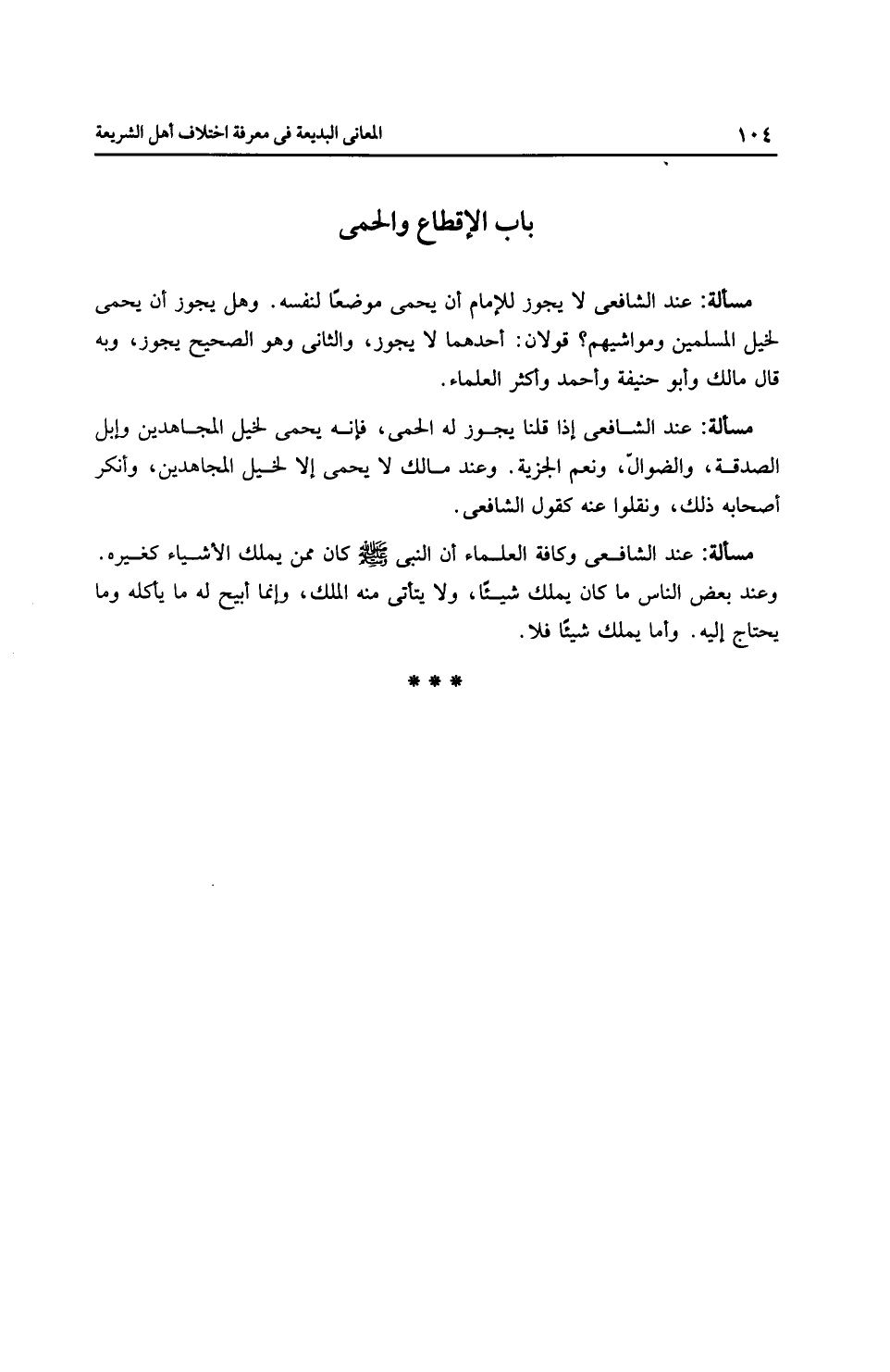 مَسْأَلَةٌ: عِنْدَ الشَّافِعِيِّ لا يجوز للإمام أن يحمى موضعًا لنفسه. وهل يجوز أن يحمى لخيل المسلمين ومواشيهم؟ قَوْلَانِ: أحدهما لا يجوز، والثاني وهو الصحيح يجوز، وبه قال مالك وأبو حَنِيفَةَ وَأَحْمَد وأَكْثَر الْعُلَمَاءِ.