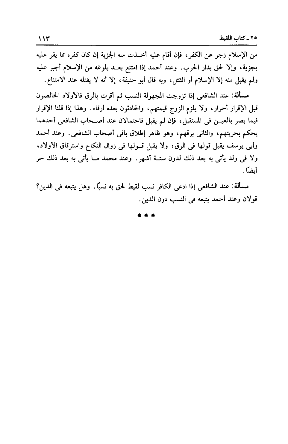 مَسْأَلَةٌ: عِنْدَ الشَّافِعِيِّ إذا ادعى الكافر نسب لقيط لحق به نسبًا. وهل يتبعه في الدين؟ قَوْلَانِ وعند أَحْمَد يتبعه في النسب دون الدين.