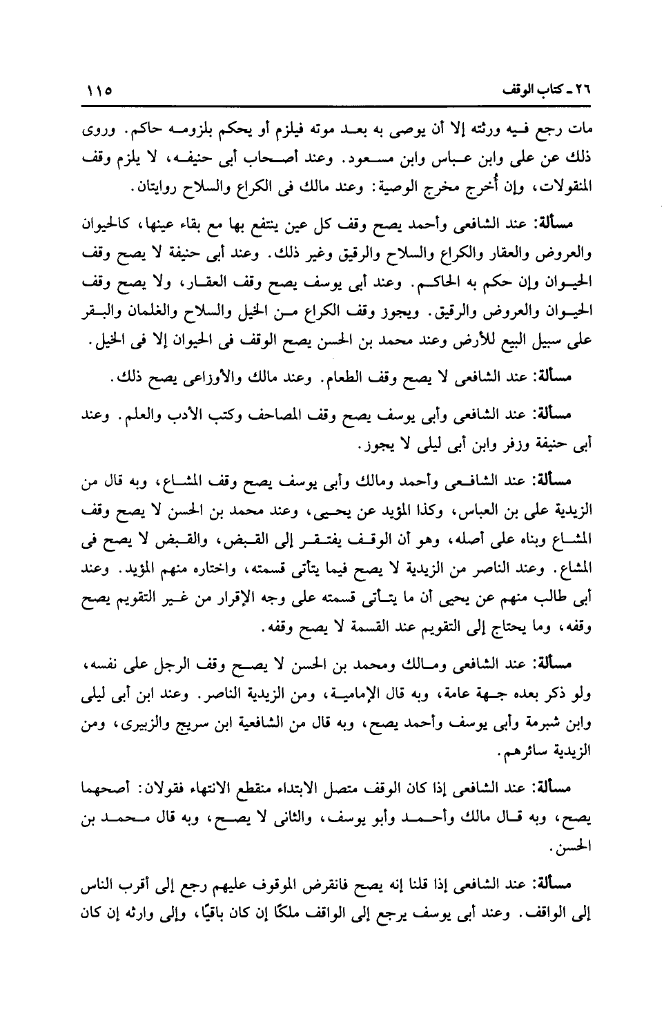 مَسْأَلَةٌ: عِنْدَ الشَّافِعِيِّ وَأَحْمَدَ يصح وقف كل عين ينتفع بها مع بقاء عينها، كالحيوان والعروض والعقار والكراع والسلاح والرقيق وغير ذلك. وعند أَبِي حَنِيفَةَ لا يصح وقف الحيوان وإن حكم به الحاكم. وعند أَبِي يُوسُفَ يصح وقف العقار، ولا يصح وقف الحيوان والعروض والرقيق. ويجوز وقف الكراع من الخيل والسلاح والغلمان والبقر على سبيل البيع للأرض وعند مُحَمَّد بن الحسن يصح الوقف في الحيوان إلا في الخيل.