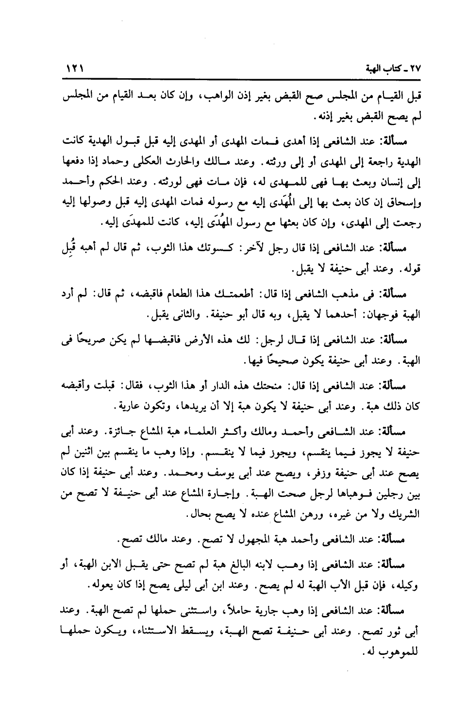 مَسْأَلَةٌ: عِنْدَ الشَّافِعِيِّ إذا أهدى فمات المهدي أو المهدَى إليه قبل قبول الهدية كانت الهدية راجعة إلى المهدي أو إلى ورثته. وعند مالك والحارث العكلي وحماد إذا دفعها إلى إنسان وبعث بها فهي للمهدى له، فإن مات فهي لورثته. وعند الحكم وَأَحْمَد وإِسْحَاق إن كان بعث بها إلى المُهدَى إليه مع رسوله فمات المهدى إليه قبل وصولها إليه رجعت إلى المهدي، وإن كان بعثها مع رسول المُهدَى إليه، كانت للمهدَى إليه.