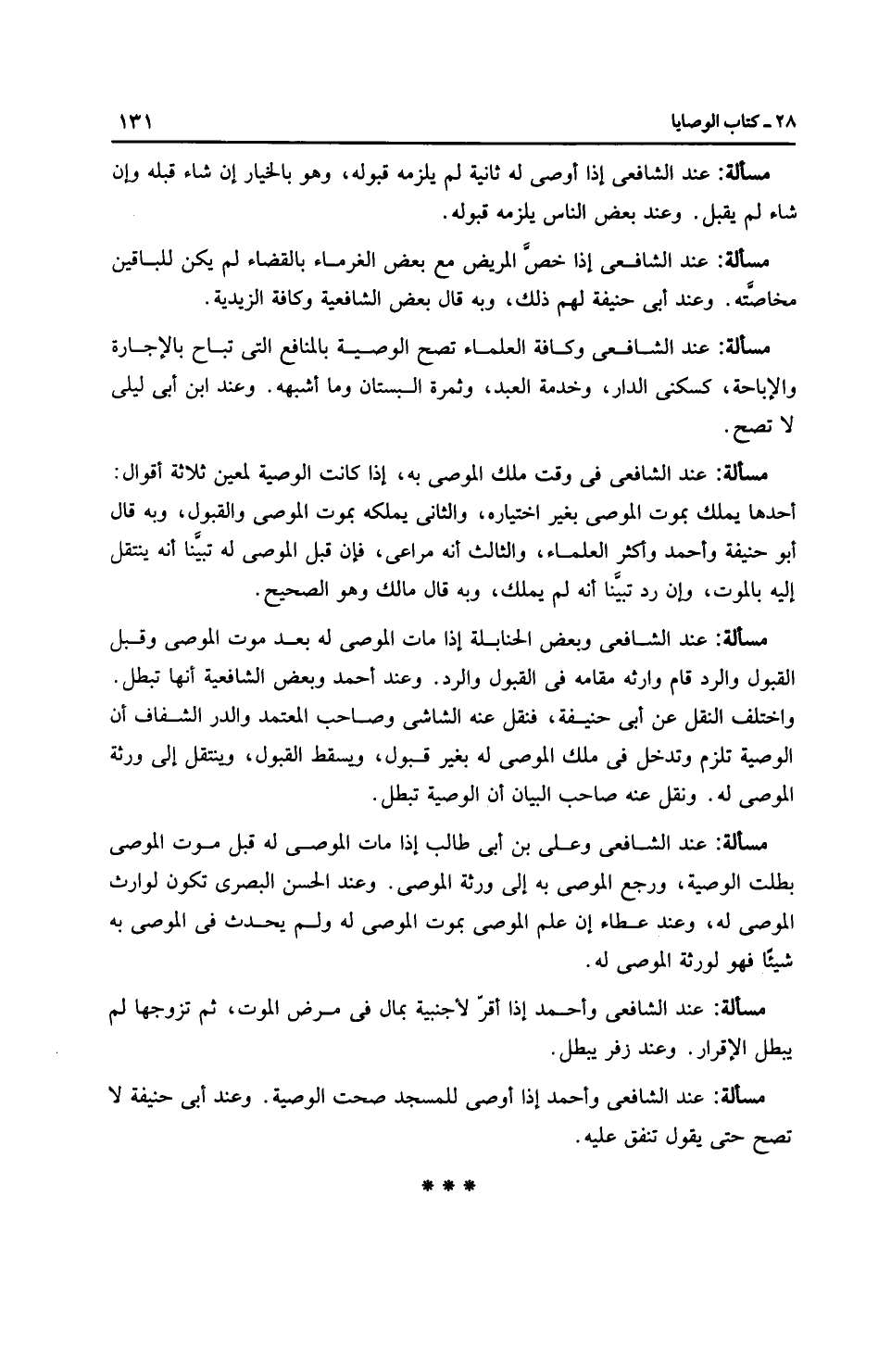 مَسْأَلَةٌ: عِنْدَ الشَّافِعِيِّ وعلي بن أبي طالب إذا مات الموصى له قبل موت الموصي بطلت الوَصِيَّة، ورجع الموصى به إلى ورثة الموصي. وعند الحسن البصري تكون لوارث الموصى له، وعند عَطَاء إن علم الموصي بموت الموصى له ولم يحدث في الموصى به شيئًا فهو لورثة الموصى له.