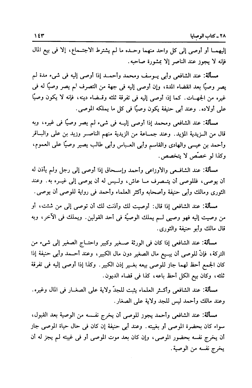 مَسْأَلَةٌ: عِنْدَ الشَّافِعِيِّ وأَبِي يُوسُفَ ومُحَمَّد وَأَحْمَد إذا أوصى إليه في شيء مدة لم يصر وصيًا بعد انقضاء المدة، وإن أوصى إليه في جهة من التصرف لم يصر وصيًا له في غيره من الجهات. كما إذا أوصى إليه في تفرقة ثلثه وقضاء دينه، فإنه لا يكون وصيًا على أولاده. وعند أَبِي حَنِيفَةَ يكون وصيًا في كل ما يملكه الموصى.