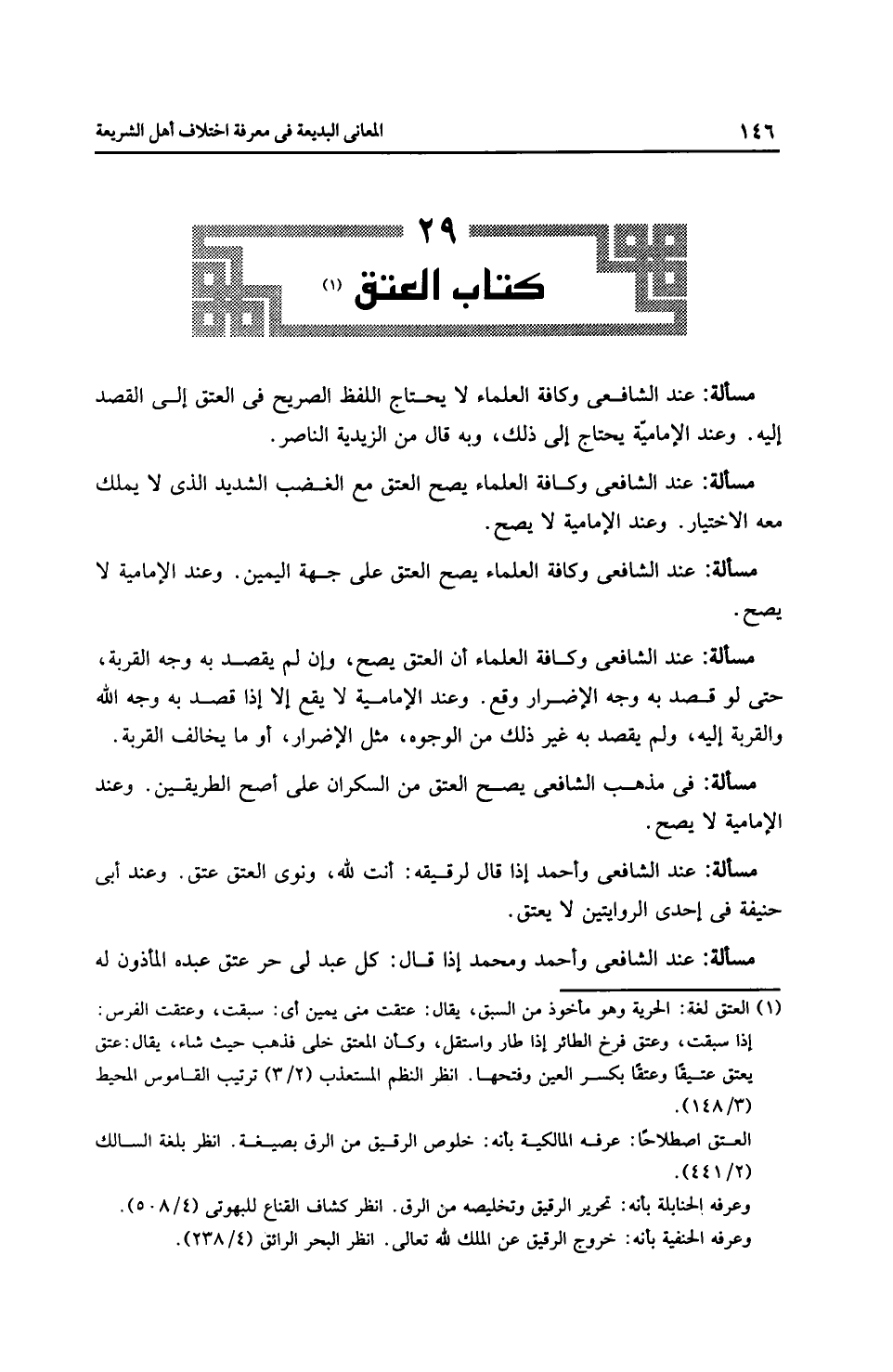مَسْأَلَةٌ: عِنْدَ الشَّافِعِيِّ وكافة العلماء أن العتق يصح، وإن لم يقصد به وجه القربة، حتى لو قصد به وجه الإضرار وقع. وعند الْإِمَامِيَّة لا يقع إلا إذا قصد به وجه الله والقربة إليه، ولم يقصد به غير ذلك من الوجوه، مثل الإضرار، أو ما يخالف القربة.