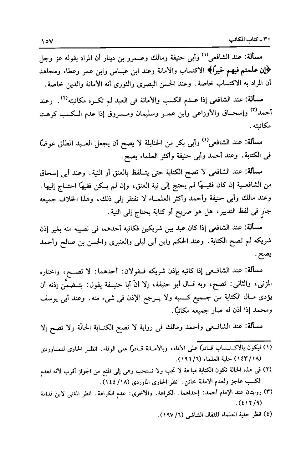 مَسْأَلَةٌ: عِنْدَ الشَّافِعِيِّ وأَبِي حَنِيفَةَ وَمَالِك وعمرو بن دينار أن المراد بقوله عز وجل (إِنْ عَلِمْتُمْ فِيهِمْ خَيْرًا) الاكتساب والأمانة وعند ابن عَبَّاسٍ وابن عمر وعَطَاء ومجاهد أن المراد به الاكتساب خاصة. وعند الحسن البصري والثَّوْرِيّ أنه الأمانة والدِّين خاصة.