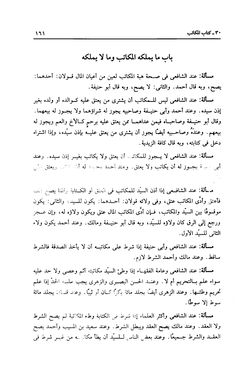 مَسْأَلَةٌ: عِنْدَ الشَّافِعِيِّ وأَكْثَر الْعُلَمَاءِ إذا شرط في الكتابة وطء المكاتبة لم يصح الشرط ولا العقد. وعند مالك يصح العقد ويبطل الشرط. وعند سعيد بن المسيب وَأَحْمَد يصح العقد والشرط جميعًا. وعند بعض الناس، للسيّد أن يطأ مكاتبته من غير شرط في