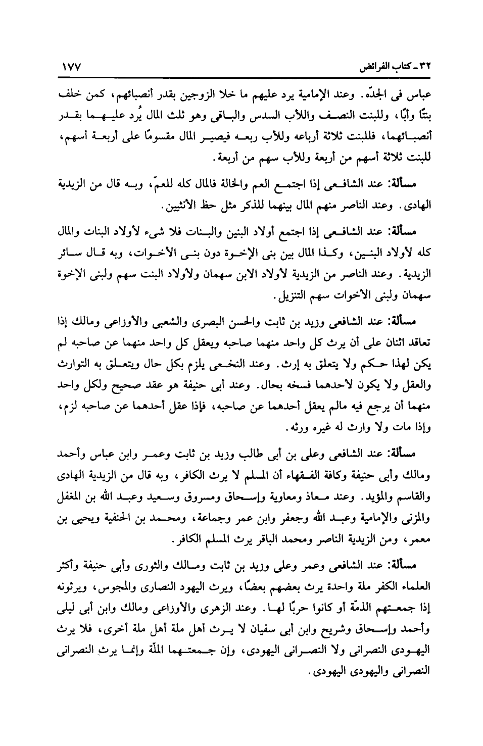 مَسْأَلَةٌ: عِنْدَ الشَّافِعِيِّ إذا اجتمع أولاد البنين والبنات فلا شيء لأولاد البنات والمال كله لأولاد البنين، وكذا المال بين بني الإخوة دون بني الأخوات، وبه قال سائر الزَّيْدِيَّة. وعند النَّاصِر من الزَّيْدِيَّة لأولاد الابن سهمان ولأولاد البنت سهم ولبني الإخوة سهمان ولبني الأخوات سهم التنزيل.