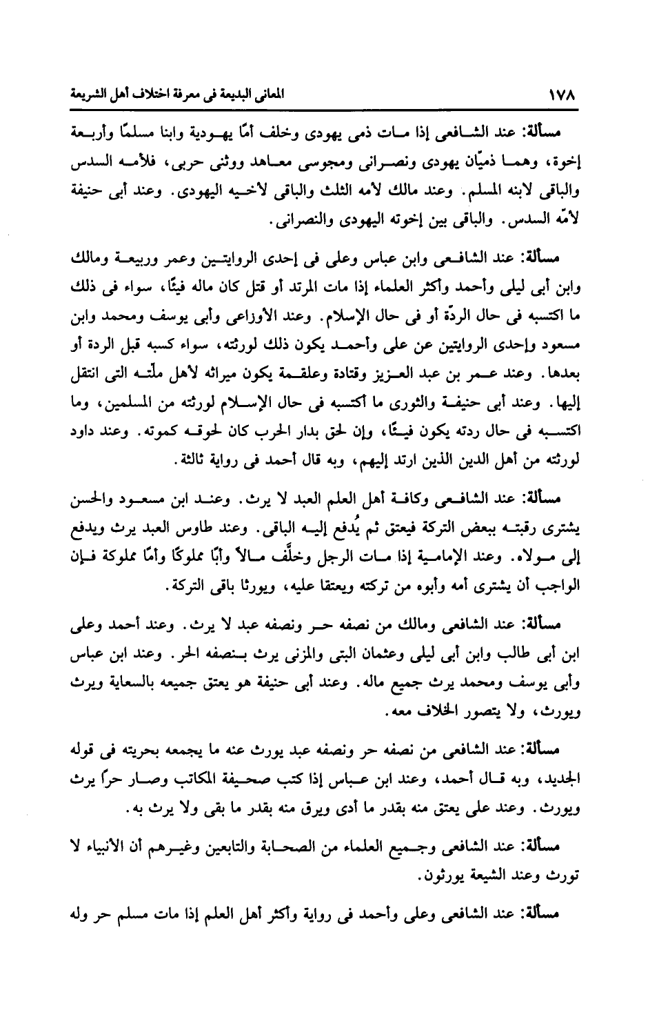 مَسْأَلَةٌ: عِنْدَ الشَّافِعِيِّ إذا مات ذمي يهودي وخلف أمًّا يهودية وابنا مسلمًا وأربعة إخوة، وهما ذمّيان يهودي ونصراني ومجوسي معاهد ووثني حربي، فلأمه السدس والباقي لابنه المسلم. وعند مالك لأمه الثلث والباقي لأخيه اليهودي. وعند أَبِي حَنِيفَةَ لأمّه السدس. والباقي بين إخوته اليهودي والنصراني.