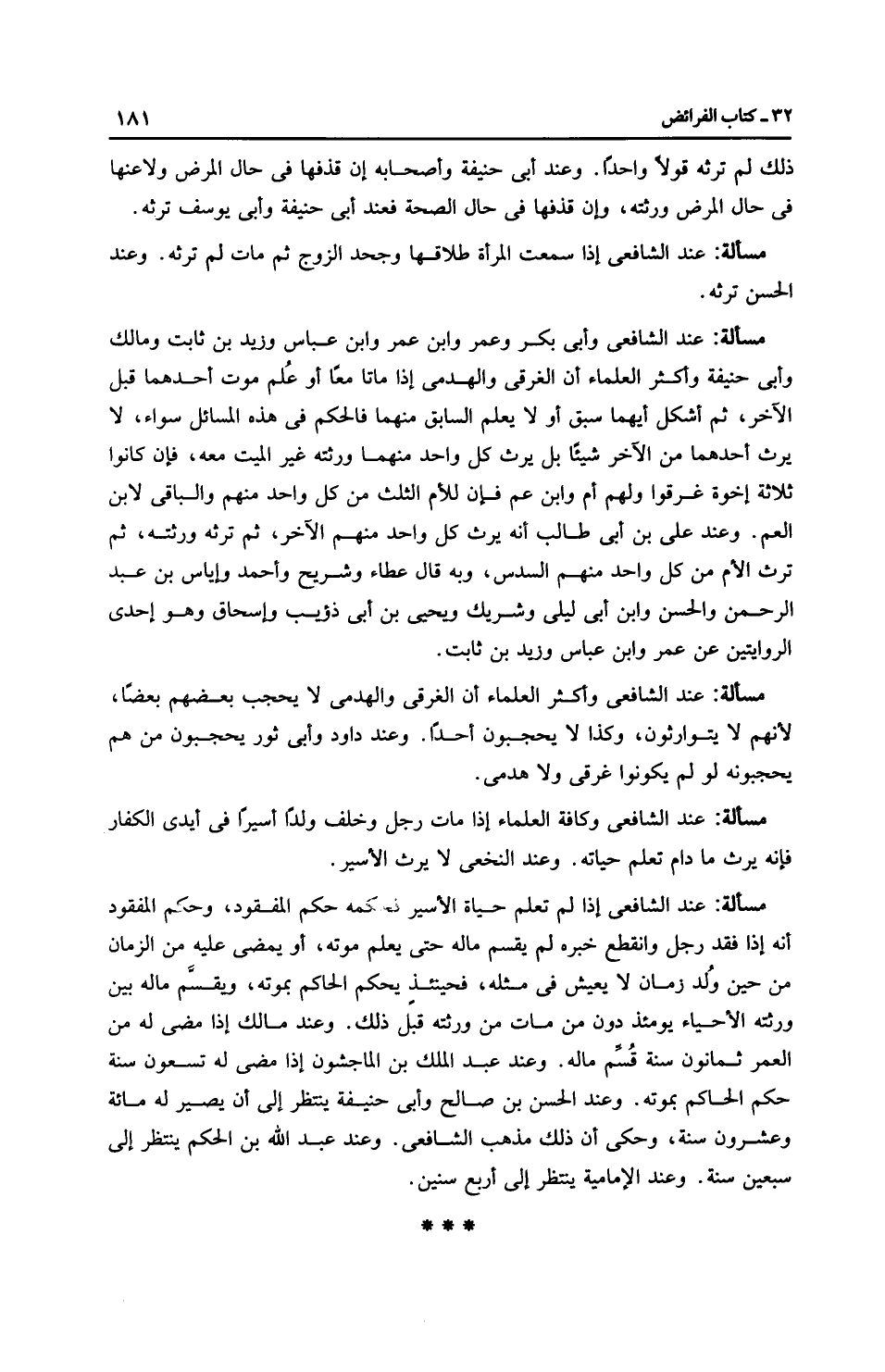 مَسْأَلَةٌ: عِنْدَ الشَّافِعِيِّ إذا لم تعلم حياة الأسير فحكمه حكم المفقود، وحكم المفقود أنه إذا فقد رجل وانقطع خبره لم يقسم ماله حتى يعلم موته، أو يمضي عليه من الزمان من حين وُلد زمان لا يعيش في مثله، فحينئذ يحكم الحاكم بموته، ويقسَّم ماله بين ورثته الأحياء يومئذ دون من مات من ورثته قبل ذلك. وعند مالك إذا مضى له من العمر ثمانون سنة قُسِّم ماله. وعند عبد الملك بن الْمَاجِشُون إذا مضى له تسعون سنة حكم الحاكم بموته. وعند الحسن بن صالح وأَبِي حَنِيفَةَ ينتظر إلى أن يصير له مائة وعشرون سنة، وحكى أن ذلك مذهب الشَّافِعِيّ. وعند عبد الله بن الحكم ينتظر إلى سبعين سنة. وعند الْإِمَامِيَّة ينتظر إلى أربع سنين.