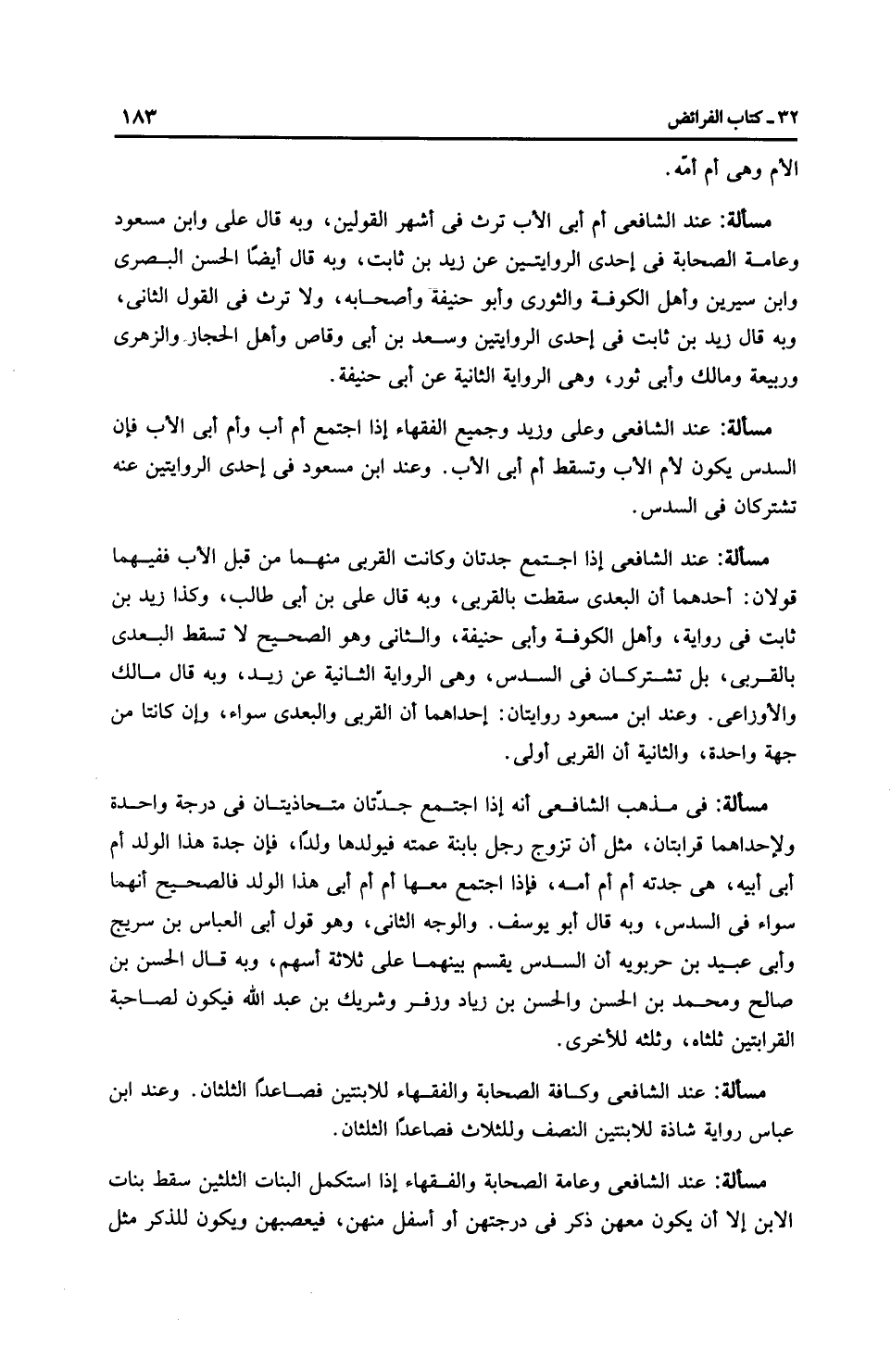 مَسْأَلَةٌ: عِنْدَ الشَّافِعِيِّ وعلى وزيد وجميع الفقهاء إذا اجتمع أم أب وأم أبي الأب فإن السدس يكون لأم الأب وتسقط أم أبي الأب. وعند ابن مسعود في إحدى الروايتين عنه تشتركان في السدس.
