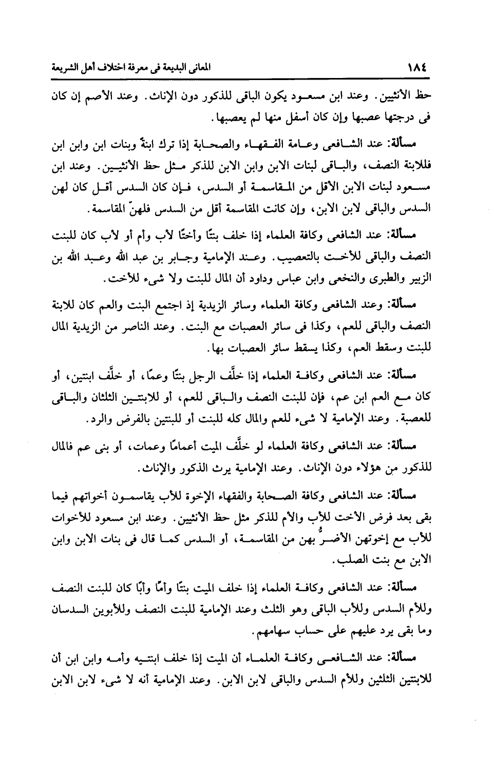 مَسْأَلَةٌ: عِنْدَ الشَّافِعِيِّ وكافة العلماء إذا خلَّف الرجل بنتًا وعمًا، أو خلَّف ابنتين، أو كان مع العم ابن عم، فإن للبنت النصف والباقي للعم، أو للابتتين الثلثان والباقي للعصبة. وعند الْإِمَامِيَّة لا شيء للعم والمال كله للبنت أو للبنتين بالفرض والرد.