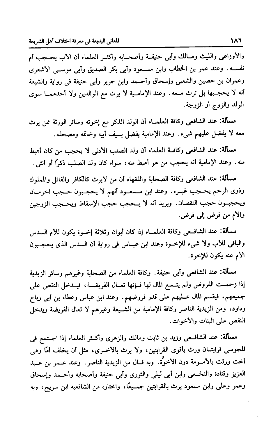 مَسْأَلَةٌ: عِنْدَ الشَّافِعِيِّ وكافة العلماء إذا كان أبوان وثلاثة إخوة يكون للأم السدس والباقي للأب ولا شيء للإخوة وعند ابن عَبَّاسٍ في رِوَايَة أن السدس الذي يحجبون الأم عنه يكون للإخوة.