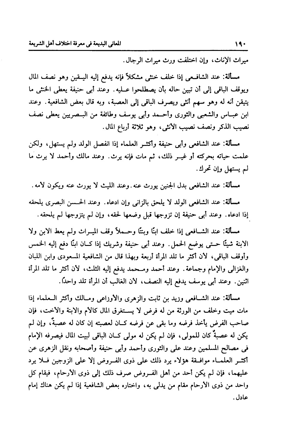 مَسْأَلَةٌ: عِنْدَ الشَّافِعِيِّ إذا خلف خنثى مشكلاً فإنه يدفع إليه اليقين وهو نصف المال ويوقف الباقي إلى أن تبين حاله بأن يصطلحوا عليه. وعند أَبِي حَنِيفَةَ يعطى الخنثى ما يتيقن أنه له وهو سهم أنثى ويصرف الباقي إلى العصبة، وبه قال بعض الشَّافِعِيَّة. وعند ابن عَبَّاسٍ والشعبي والثَّوْرِيّ وَأَحْمَد وأَبِي يُوسُفَ وطائفة من البصريين يعطى نصف نصيب الذكر ونصف نصيب الأنثى، وهو ثلاثة أرباع المال.