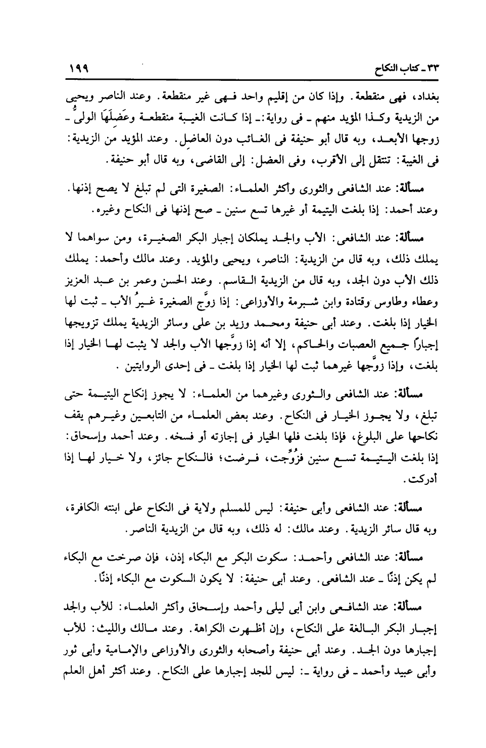 مَسْأَلَةٌ: عِنْدَ الشَّافِعِيِّ وأَبِي حَنِيفَةَ: ليس للمسلم ولاية في النكاح على ابنته الكافرة، وبه قال سائر الزَّيْدِيَّة. وعند مالك: له ذلك، وبه قال من الزَّيْدِيَّة النَّاصِر.
