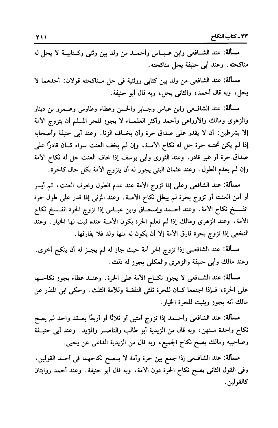 مَسْأَلَةٌ: عِنْدَ الشَّافِعِيِّ وابن عَبَّاسٍ وجابر والحسن وعَطَاء وطاوس وعمرو بن دينار والزُّهْرِيّ وَمَالِك والْأَوْزَاعِيّ وَأَحْمَد وأَكْثَر الْعُلَمَاءِ لا يجوز للحر المسلم أن يتزوج الأمة إلا بشرطين: أن لا يقدر على صداق حرة وأن يخاف الزنا. وعند أَبِي حَنِيفَةَ وأصحابه إذا لم يكن تحته حرة حلَّ له نكاح الأمة، وإن لم يخف العنت سواء كان قادرًا على صداق حرة أو غير قادر. وعند الثَّوْرِيّ وأَبِي يُوسُفَ إذا خاف العنت حلَّ له نكاح الأمة وإن لم يعدم الطَّول. وعند عثمان البتي يجوز له أن يتزوج الأمة بكل حال كالحرة.