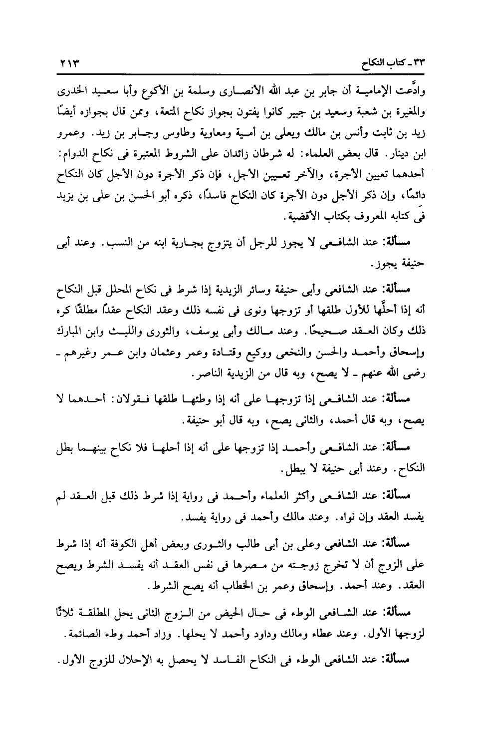 مَسْأَلَةٌ: عِنْدَ الشَّافِعِيِّ وأَبِي حَنِيفَةَ وسائر الزَّيْدِيَّة إذا شرط في نكاح المحلل قبل النكاح أنه إذا أحلَّها للأول طلقها أو تزوجها ونوى في نفسه ذلك وعقد النكاح عقدًا مطلقًا كره ذلك وكان العقد صحيحًا. وعند مالك وأَبِي يُوسُفَ، والثَّوْرِيّ واللَّيْث وابن الْمُبَارَك وإِسْحَاق وَأَحْمَد والحسن والنَّخَعِيّ ووكيع وقتادة وعمر وعثمان وابن عمر وغيرهم - رضي الله عنهم - لا يصح، وبه قال من الزَّيْدِيَّة النَّاصِر.