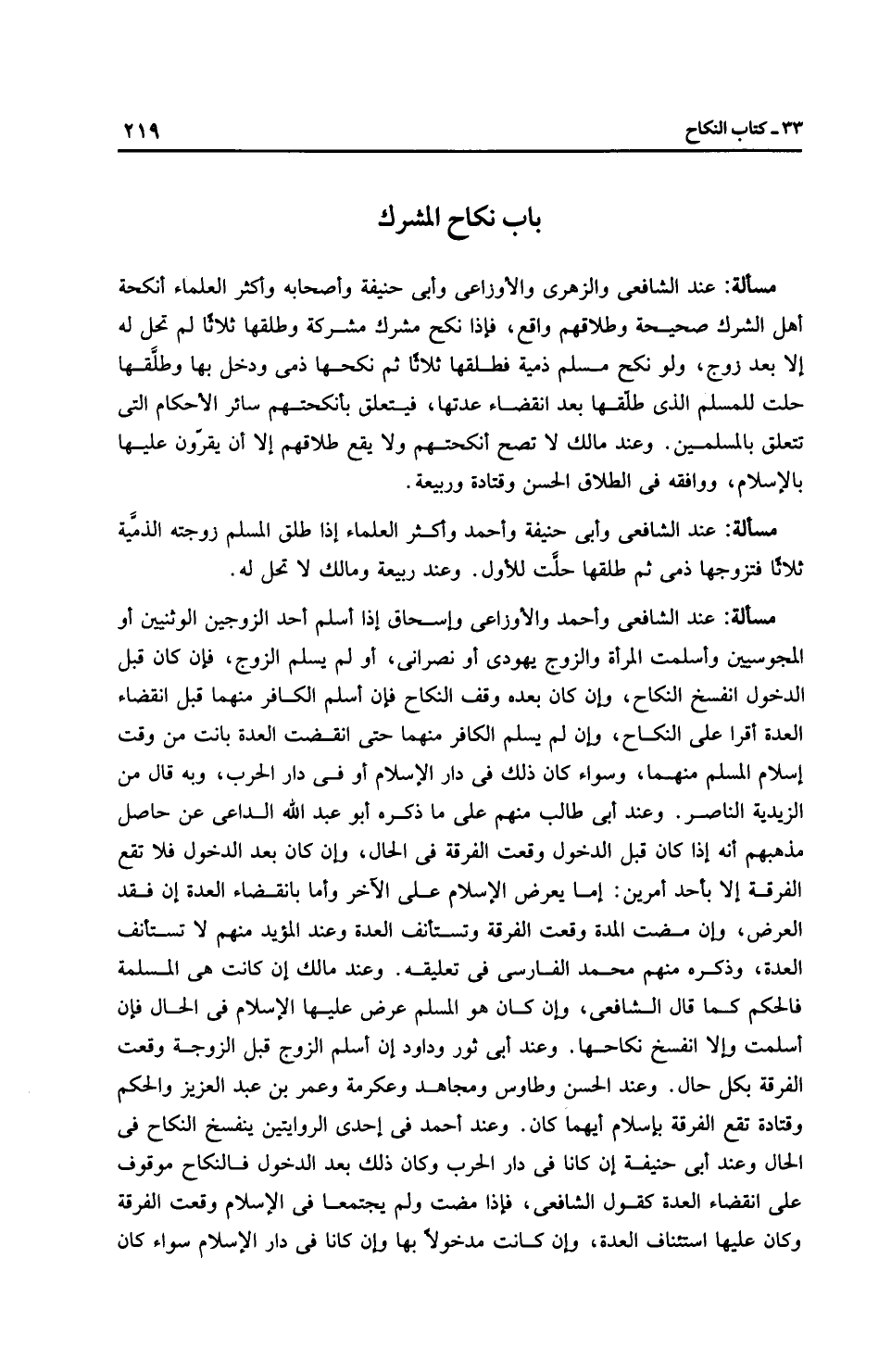 مَسْأَلَةٌ: عِنْدَ الشَّافِعِيِّ والزُّهْرِيّ والْأَوْزَاعِيّ وأَبِي حَنِيفَةَ وأصحابه وأَكْثَر الْعُلَمَاءِ أنكحة أهل الشرك صحيحة وطلاقهم واقع، فإذا نكح مشرك مشركة وطلقها ثلاثًا لم تحل له إلا بعد زوج، ولو نكح مسلم ذمية فطلقها ثلاثًا ثم نكحها ذمي ودخل بها وطلَّقها حلت للمسلم الذي طلّقها بعد انقضاء عدتها، فيتعلق بأنكحتهم سائر الأحكام التي تتعلق بالمسلمين. وعند مالك لا تصح أنكحتهم ولا يقع طلاقهم إلا أن يقرّون عليها بالْإِسْلَام، ووافقه في الطلاق الحسن وقتادة ورَبِيعَة.