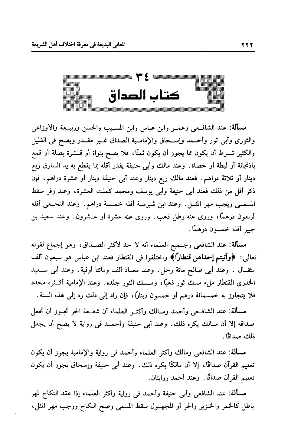 مَسْأَلَةٌ: عِنْدَ الشَّافِعِيِّ وجميع العلماء أنه لا حد لأكثر الصداق، وهو إجماع لقوله تعالى: (وَآتَيْتُمْ إِحْدَاهُنَّ قِنْطَارًا) واختلفوا في القنطار فعند ابن عَبَّاسٍ هو سبعون ألف مثقال. وعند أبي صالح مائة رحل. وعند معاذ ألف ومائتا أوقية. وعند أبي سعيد الخدري القنطار ملء مسك ثور ذهبًا، ومسك الثور جلده. وعند الْإِمَامِيَّة أكثره محدد فلا يتجاوز به خمسمائة درهم أو خمسون دينارًا، فإن زاد إلى ذلك ردّ إلى هذه السنة.