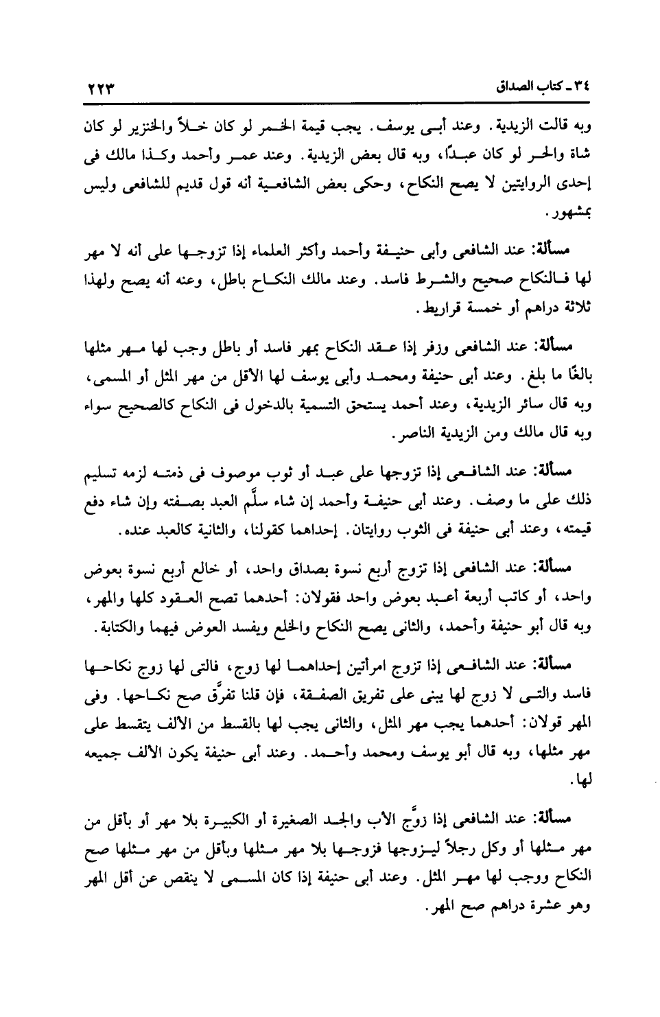 مَسْأَلَةٌ: عِنْدَ الشَّافِعِيِّ وزفر إذا عقد النكاح بمهر فاسد أو باطل وجب لها مهر مثلها بالغًا ما بلغ. وعند أَبِي حَنِيفَةَ ومُحَمَّد وأَبِي يُوسُفَ لها الأقل من مهر المثل أو المسمى، وبه قال سائر الزَّيْدِيَّة، وعند أَحْمَد يستحق التسمية بالدخول في النكاح كالصحيح سواء وبه قال مالك ومن الزَّيْدِيَّة النَّاصِر.