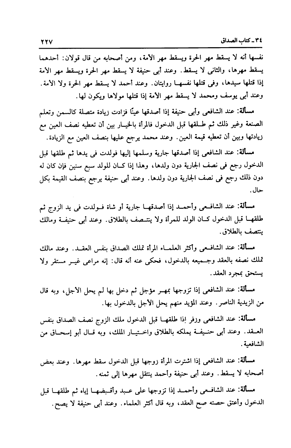 مَسْأَلَةٌ: عِنْدَ الشَّافِعِيِّ وَأَحْمَدَ إذا أصدقها جارية أو شاة فولدت في يد الزوج ثم طلقها قبل الدخول كان الولد للمرأة ولا ينتصف بالطلاق. وعند أَبِي حَنِيفَةَ ومالك ينتصف بالطلاق.