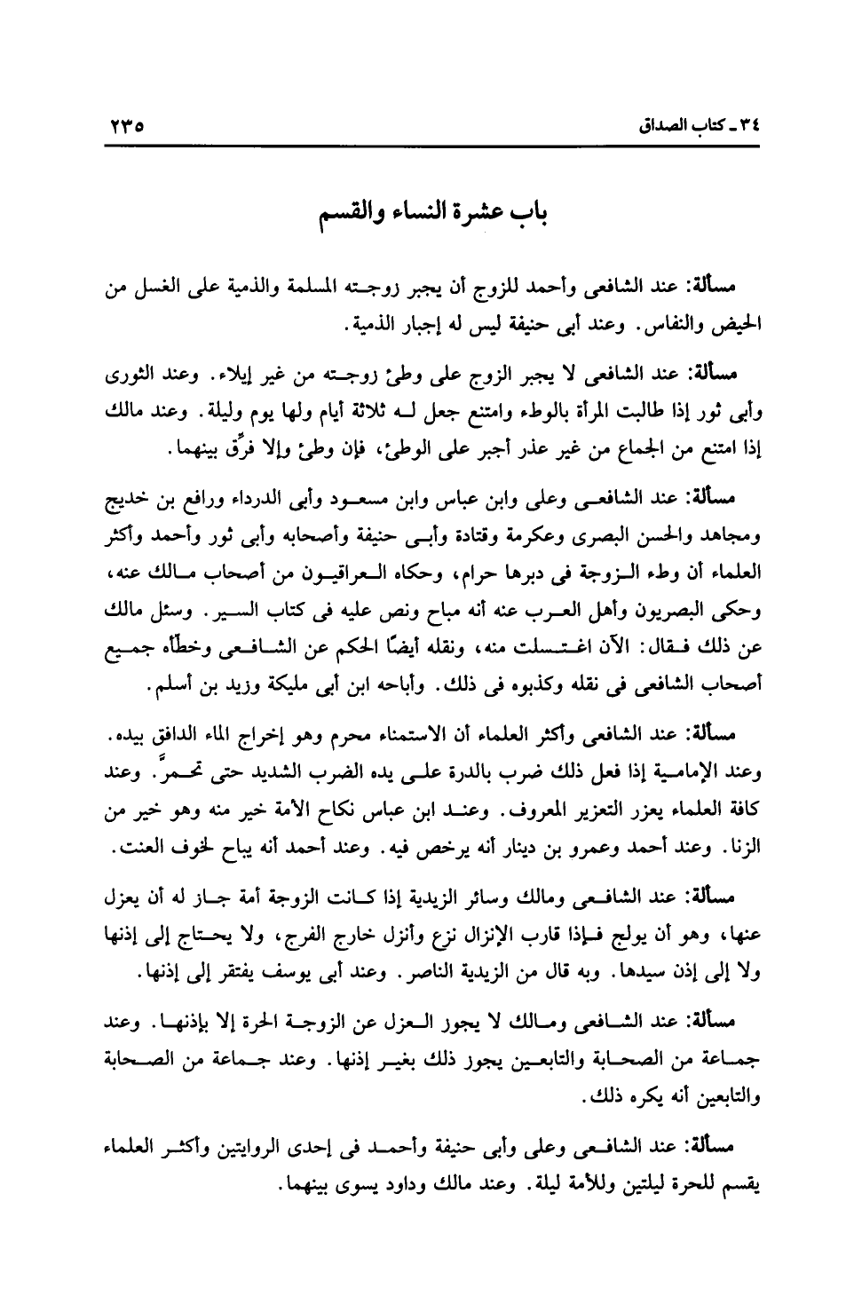 مَسْأَلَةٌ: عِنْدَ الشَّافِعِيِّ لا يجبر الزوج على وطئ زوجته من غير إيلاء. وعند الثَّوْرِيّ وأَبِي ثَورٍ إذا طالبت المرأة بالوطء وامتنع جعل له ثلاثة أيام ولها يوم وليلة. وعند مالك إذا امتنع من الجماع من غير عذر أجبر على الوطئ، فإن وطئ وإلا فرق بينهما.