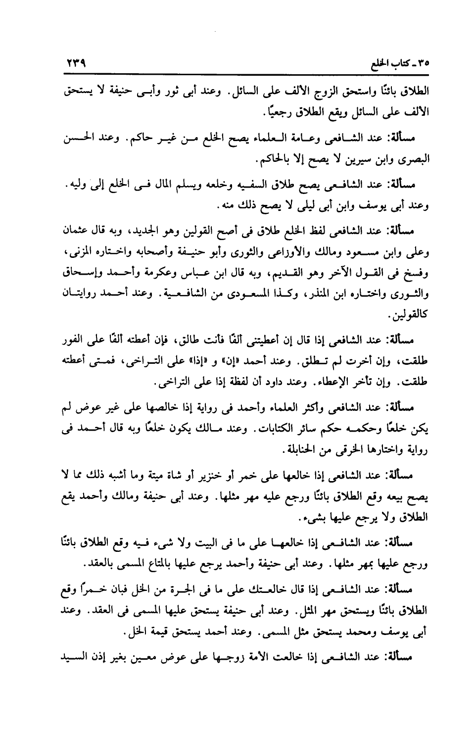 مَسْأَلَةٌ: عِنْدَ الشَّافِعِيِّ إذا خالعها على خمر أو خنزير أو شاة ميتة وما أشبه ذلك مما لا يصح بيعه وقع الطلاق بائنًا ورجع عليه مهر مثلها. وعند أَبِي حَنِيفَةَ وَمَالِك وَأَحْمَد يقع الطلاق ولا يرجع عليها بشيء.