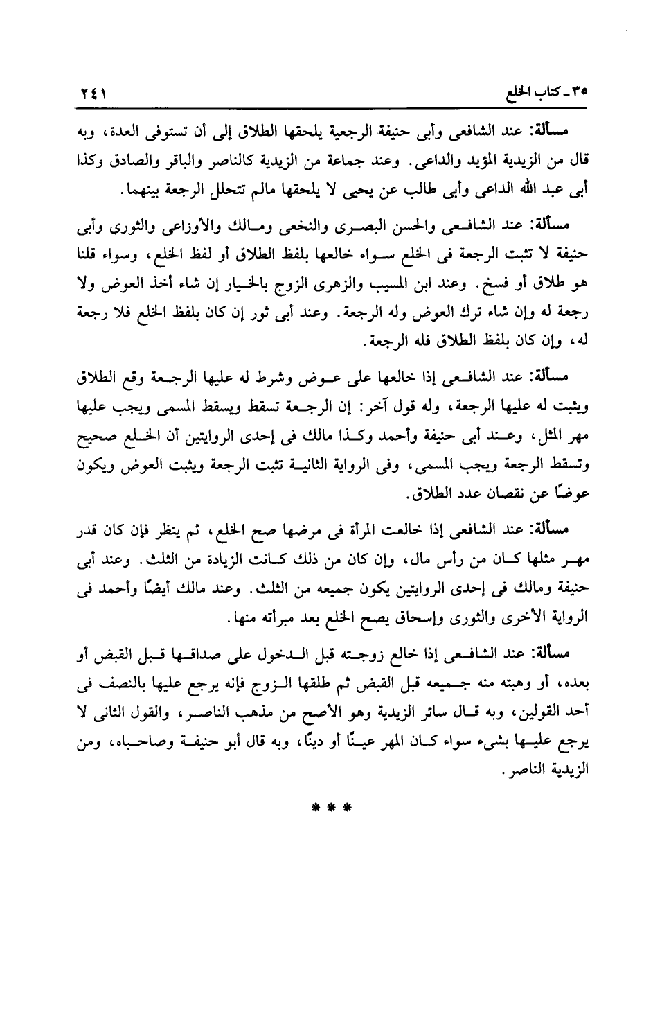 مَسْأَلَةٌ: عِنْدَ الشَّافِعِيِّ إذا خالعها على عوض وشرط له عليها الرجعة وقع الطلاق ويثبت له عليها الرجعة، وله قول آخر: إن الرجعة تسقط ويسقط المسمى ويجب عليها مهر المثل، وعند أَبِي حَنِيفَةَ وَأَحْمَد وكذا مالك في إحدى الروايتين أن الخلع صحيح وتسقط الرجعة ويجب المسمى، وفي الرِوَايَة الثانية تثبت الرجعة ويثبت العوض ويكون عوضًا عن نقصان عدد الطلاق.