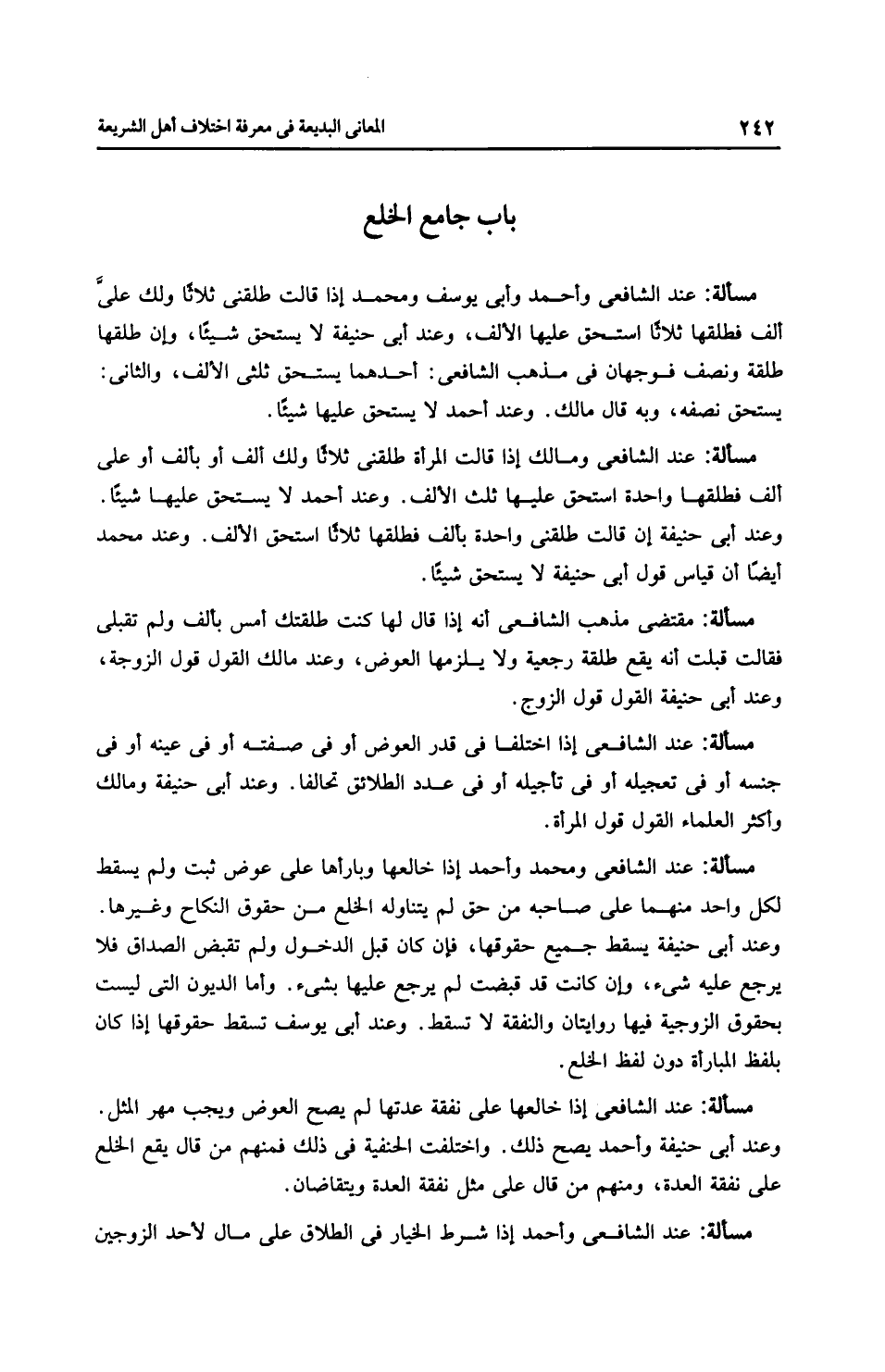 مَسْأَلَةٌ: عِنْدَ الشَّافِعِيِّ ومُحَمَّد وَأَحْمَد إذا خالعها وبارأها على عوض ثبت ولم يسقط لكل واحد منهما على صاحبه من حق لم يتناوله الخلع من حقوق النكاح وغيرها. وعند أَبِي حَنِيفَةَ يسقط جميع حقوقها، فإن كان قبل الدخول ولم تقبض الصداق فلا يرجع عليه شيء، وإن كانت قد قبضت لم يرجع عليها بشيء. وأما الديون التي ليست بحقوق الزوجية فيها رِوَايَتَانِ والنفقة لا تسقط. وعند أَبِي يُوسُفَ تسقط حقوقها إذا كان بلفظ المبارأة دون لفظ الخلع.