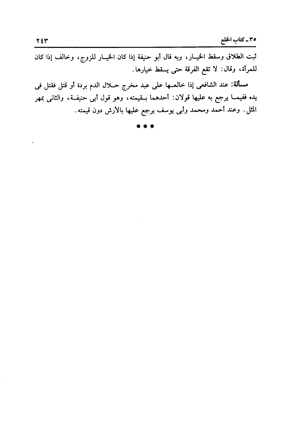 مَسْأَلَةٌ: عِنْدَ الشَّافِعِيِّ إذا خالعها على عبد مخرج حلال الدم بردة أو قتل فقتل في يده ففيما يرجع به عليها قَوْلَانِ: أحدهما بقيمته، وهو قول أَبِي حَنِيفَةَ، والثاني بمهر المثل. وعند أَحْمَد ومُحَمَّد وأَبِي يُوسُفَ يرجع عليها بالأرش دون قيمته.