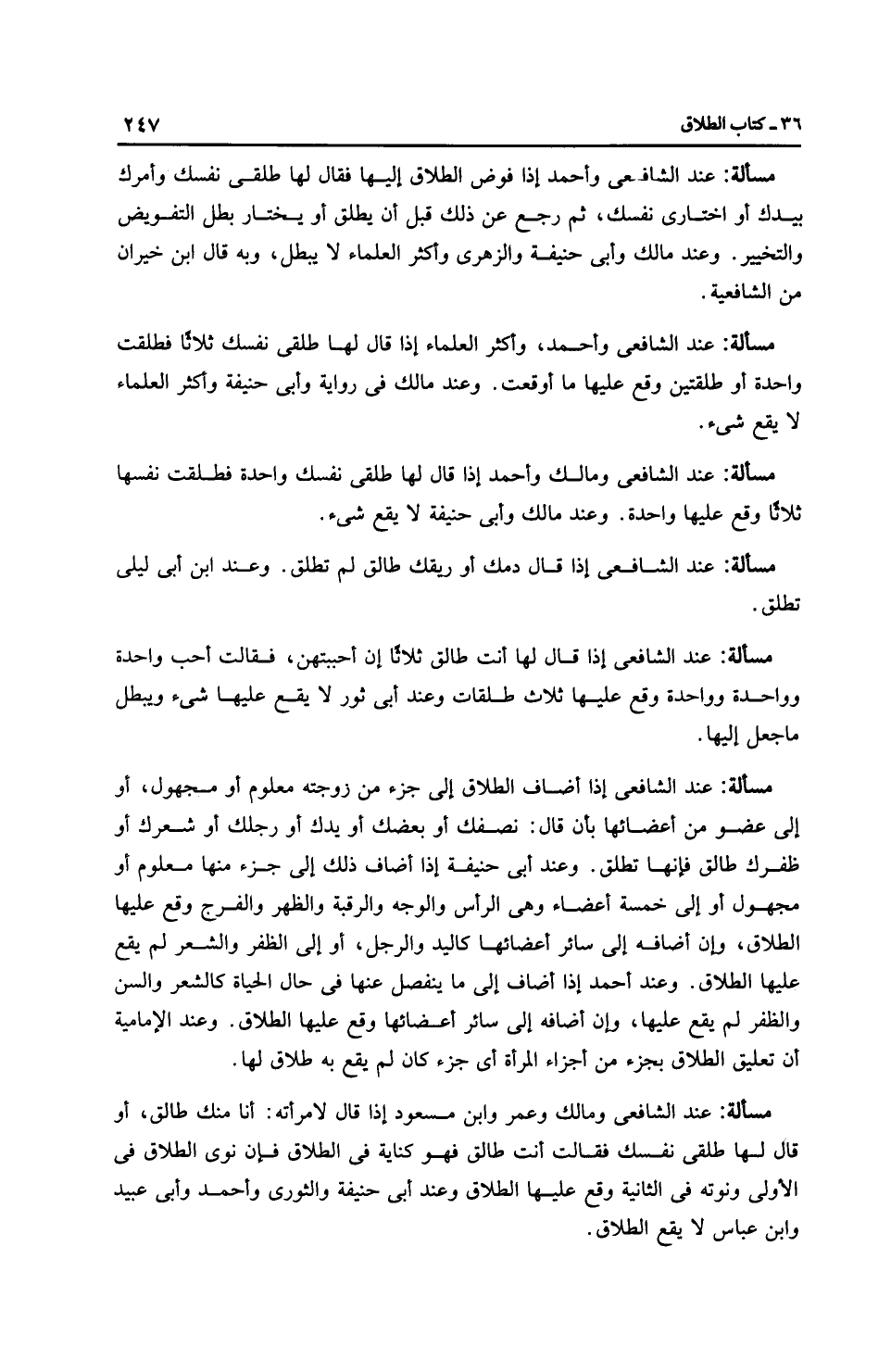 مَسْأَلَةٌ: عِنْدَ الشَّافِعِيِّ إذا أضاف الطلاق إلى جزء من زوجته معلوم أو مجهول، أو إلى عضو من أعضائها بأن قال: نصفك أو بعضك أو يدك أو رجلك أو شعرك أو ظفرك طالق فإنها تطلق. وعند أَبِي حَنِيفَةَ إذا أضاف ذلك إلى جزء منها معلوم أو مجهول أو إلى خمسة أعضاء وهي الرأس والوجه والرقبة والظهر والفرج وقع عليها الطلاق، وإن أضافه إلى سائر أعضائها كاليد والرجل، أو إلى الظفر والشعر لم يقع عليها الطلاق. وعند أَحْمَد إذا أضاف إلى ما ينفصل عنها في حال الحياة كالشعر والسن والظفر لم يقع عليها، وإن أضافه إلى سائر أعضائها وقع عليها الطلاق. وعند الْإِمَامِيَّة أن تعليق الطلاق بجزء من أجزاء المرأة أي جزء كان لم يقع به طلاق لها.
