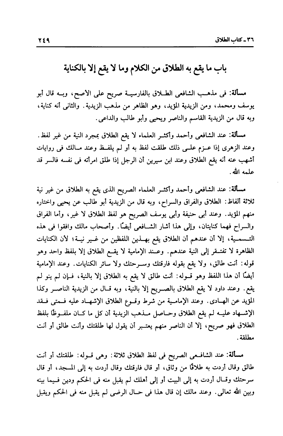 مَسْأَلَةٌ: عِنْدَ الشَّافِعِيِّ وَأَحْمَدَ وأَكْثَر الْعُلَمَاءِ الصريح الذي يقع به الطلاق من غير نية ثلاثة ألفاظ: الطلاق والفراق والسراح، وبه قال من الزَّيْدِيَّة أبو طالب عن يَحْيَى واختاره منهم المؤيَّد. وعند أَبِي حَنِيفَةَ وأَبِي يُوسُفَ الصريح هو لفظ الطلاق لا غير، وأما الفراق والسراح فهما كنايتان، وإلى هذا أشار الشَّافِعِيّ أيضًا. وأصحاب مالك وافقوا في هذه التسمية، إلا أن عندهم أن الطلاق يقع بهذين اللفظين من غير نية؛ لأن الكنايات الظاهرة لا تفتقر إلى النية عندهم. وعند الْإِمَامِيَّة لا يقع الطلاق إلا بلفظ واحد وهو قوله: أنت طالق، ولا يقع بقوله فارقتك وسرحتك ولا سائر الكنايات. وعند الْإِمَامِيَّة أيضًا أن هذا اللفظ وهو قوله: أنت طالق لا يقع به الطلاق إلا بالنية، فإن لم ينو لم يقع. وعند داود لا يقع الطلاق بالصريح إلا بالنية، وبه قال من الزَّيْدِيَّة النَّاصِر وكذا المؤيَّد عن الهادي. وعند الْإِمَامِيَّة من شرط وقوع الطلاق الإشهاد عليه فمتى فقد الإشهاد عليه لم يقع الطلاق وحاصل مذهب الزَّيْدِيَّة أن كل ما كان ملفوظًا بلفظ الطلاق فهو صريح، إلا أن النَّاصِر منهم يعتبر أن يقول لها طلقتك وأنت طالق أو أنت مطلقة.