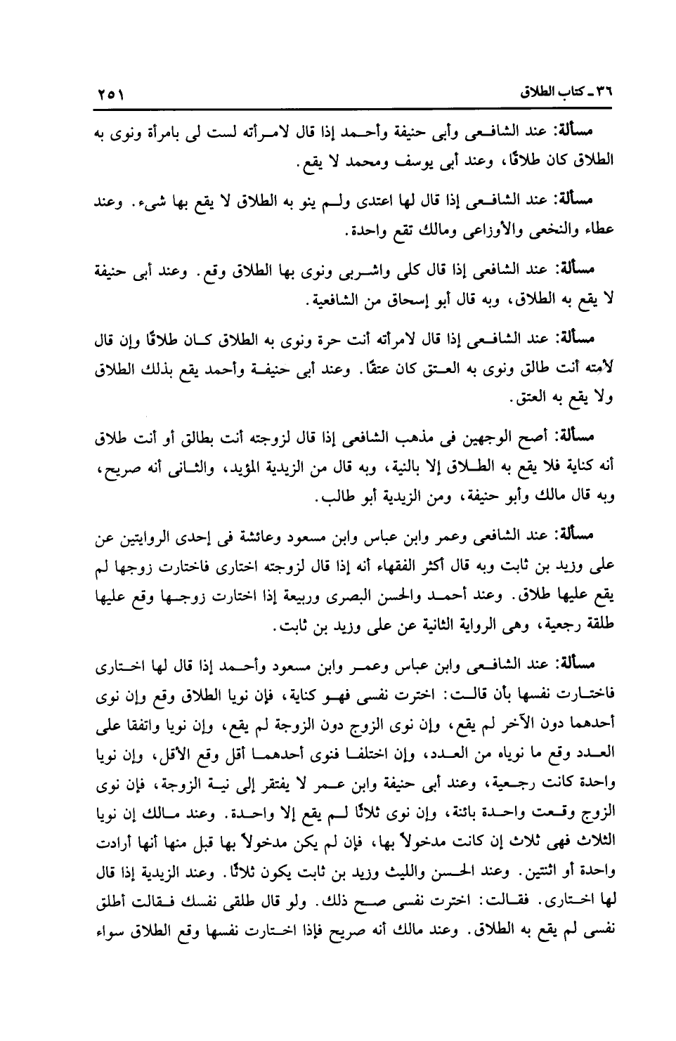 مَسْأَلَةٌ: عِنْدَ الشَّافِعِيِّ وعمر وابن عَبَّاسٍ وابن مسعود وعائشة في إحدى الروايتين عن علي وزيد بن ثابت وبه قال أكثر الفقهاء أنه إذا قال لزوجته اختاري فاختارت زوجها لم يقع عليها طلاق. وعند أَحْمَد والحسن البصري ورَبِيعَة إذا اختارت زوجها وقع عليها طلقة رجعية، وهي الرِوَايَة الثانية عن علي وزيد بن ثابت.