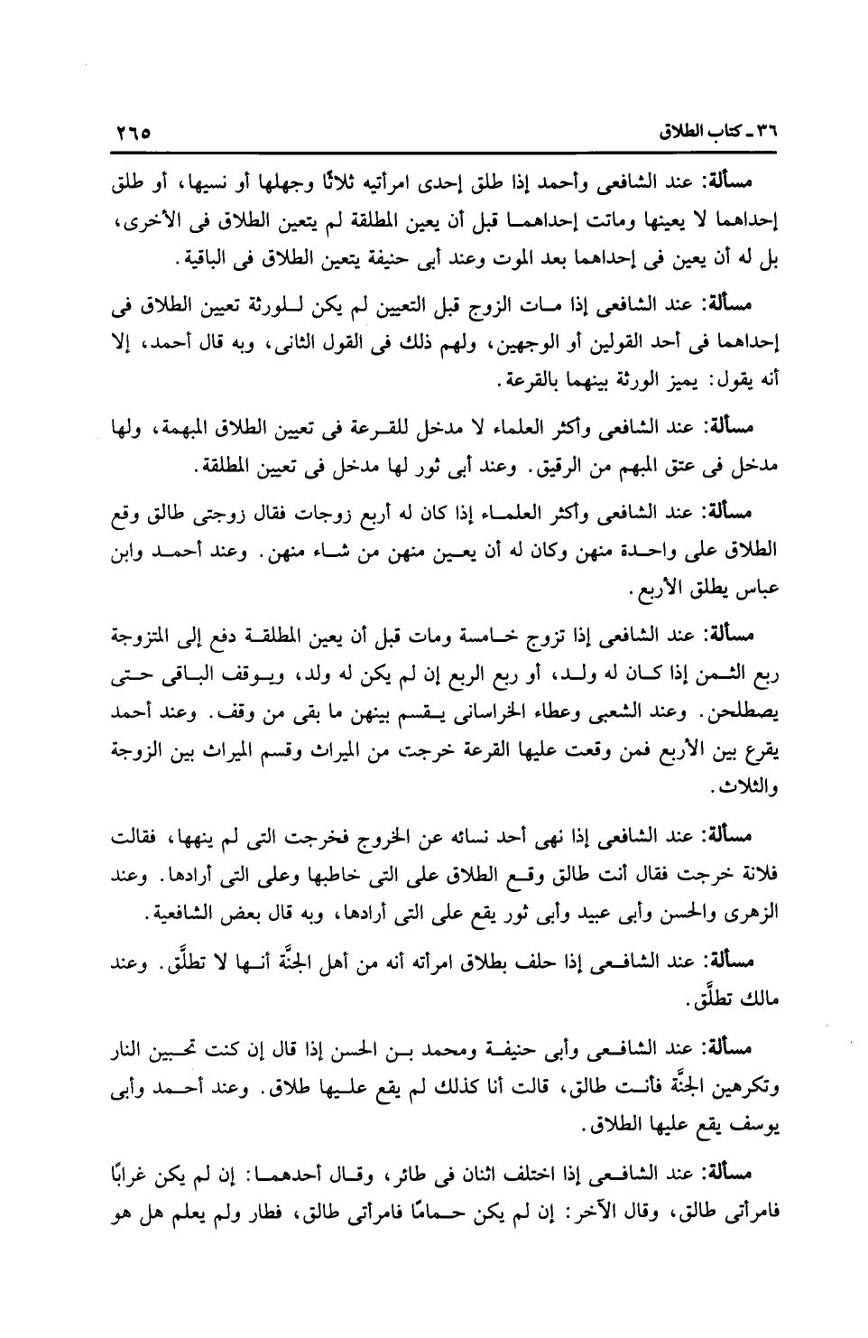مَسْأَلَةٌ: عِنْدَ الشَّافِعِيِّ وأَكْثَر الْعُلَمَاءِ إذا كان له أربع زوجات فقال زوجتي طالق وقع الطلاق على واحدة منهن وكان له أن يعين منهن من شاء منهن. وعند أَحْمَد وابن عبَّاس يطلق الأربع.