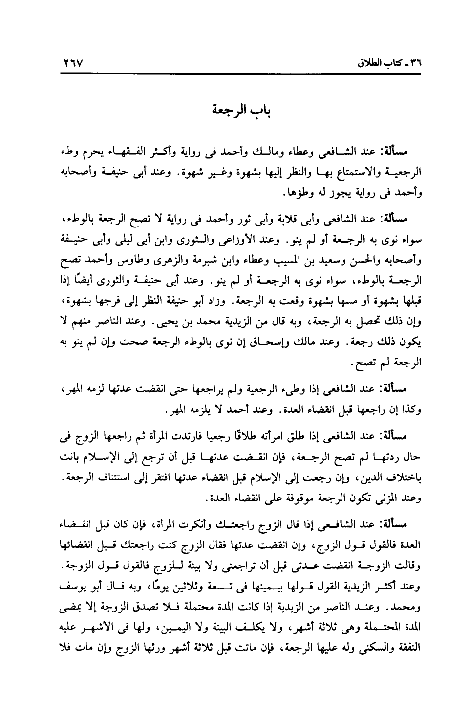 مَسْأَلَةٌ: عِنْدَ الشَّافِعِيِّ إذا قال الزوج راجعتك وأنكرت المرأة، فإن كان قبل انقضاء العدة فالقول قول الزوج، وإن انقضت عدتها فقال الزوج كنت راجعتك قبل انقضائها وقالت الزوجة انقضت عدتي قبل أن تراجعني ولا بينة للزوج فالقول قول الزوجة. وعند أكثر الزَّيْدِيَّة القول قولها بيمينها في تسعة وثلاثين يومًا، وبه قال أبو يوسف ومحمد. وعند النَّاصِر من الزَّيْدِيَّة إذا كانت المدة محتملة فلا تصدق الزوجة إلا بمضى المدة المحتملة وهي ثلاثة أشهر، ولا يكلف البينة ولا الْيَمِين، ولها في الأشهر عليه النفقة والسكنى وله عليها الرجعة، فإن ماتت قبل ثلاثة أشهر ورثها الزوج وإن مات فلا