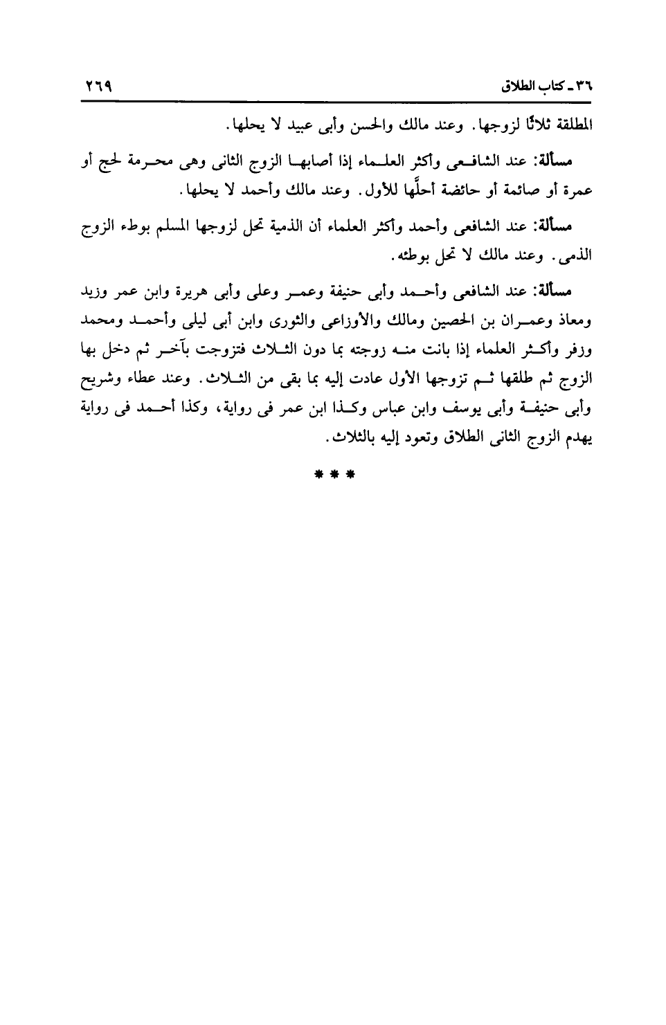 مَسْأَلَةٌ: عِنْدَ الشَّافِعِيِّ وَأَحْمَدَ وأَبِي حَنِيفَةَ وعمر وعلي وأبي هريرة وابن عمر وزيد ومعاذ وعمران بن الحصين وَمَالِك والْأَوْزَاعِيّ والثَّوْرِيّ وابن أبي ليلى وَأَحْمَد ومحمد وزفر وأَكْثَر الْعُلَمَاءِ إذا بانت منه زوجته بما دون الثلاث فتزوجت بآخر ثم دخل بها الزوج ثم طلقها ثم تزوجها الأول عادت إليه بما بقي من الثلاث. وعند عَطَاء وشريح وأَبِي حَنِيفَةَ وأَبِي يُوسُفَ وابن عَبَّاسٍ وكذا ابن عمر في رِوَايَة، وكذا أَحْمَد في رِوَايَة يهدم الزوج الثاني الطلاق وتعود إليه بالثلاث.
