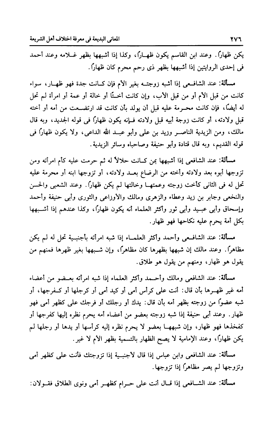 مَسْأَلَةٌ: عِنْدَ الشَّافِعِيِّ إذا أشبه زوجته بغير الأم فإن كانت جدة فهو ظهار، سواء كانت من قبل الأم أو من قبل الأب، وإن كانت أختًا أو خالة أو عمة أو امرأة لم تحل له أيضًا، فإن كانت محرمة عليه قبل أن يولد بأن كانت قد ارتضعت من أمه أو أخته قبل ولادته، أو كانت زوجة أبيه قبل ولادته فإنه يكون ظهارًا في قوله الجديد، وبه قال مالك، ومن الزَّيْدِيَّة النَّاصِر وزيد بن علي وأبو عبد الله الداعي، ولا يكون ظهارًا في قوله القديم، وبه قال قتادة وأبو حَنِيفَةَ وصاحباه وسائر الزَّيْدِيَّة.