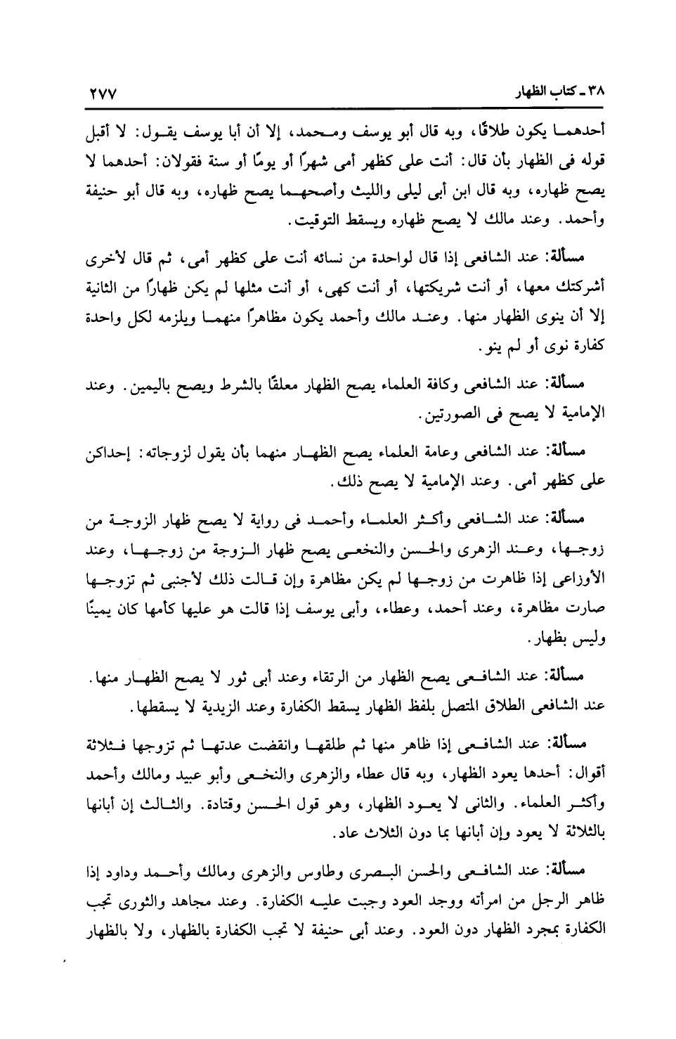مَسْأَلَةٌ: عِنْدَ الشَّافِعِيِّ يصح الظهار من الرتقاء وعند أَبِي ثَورٍ لا يصح الظهار منها. عند الشَّافِعِيّ الطلاق المتصل بلفظ الظهار يسقط الكفارة وعند الزَّيْدِيَّة لا يسقطها.