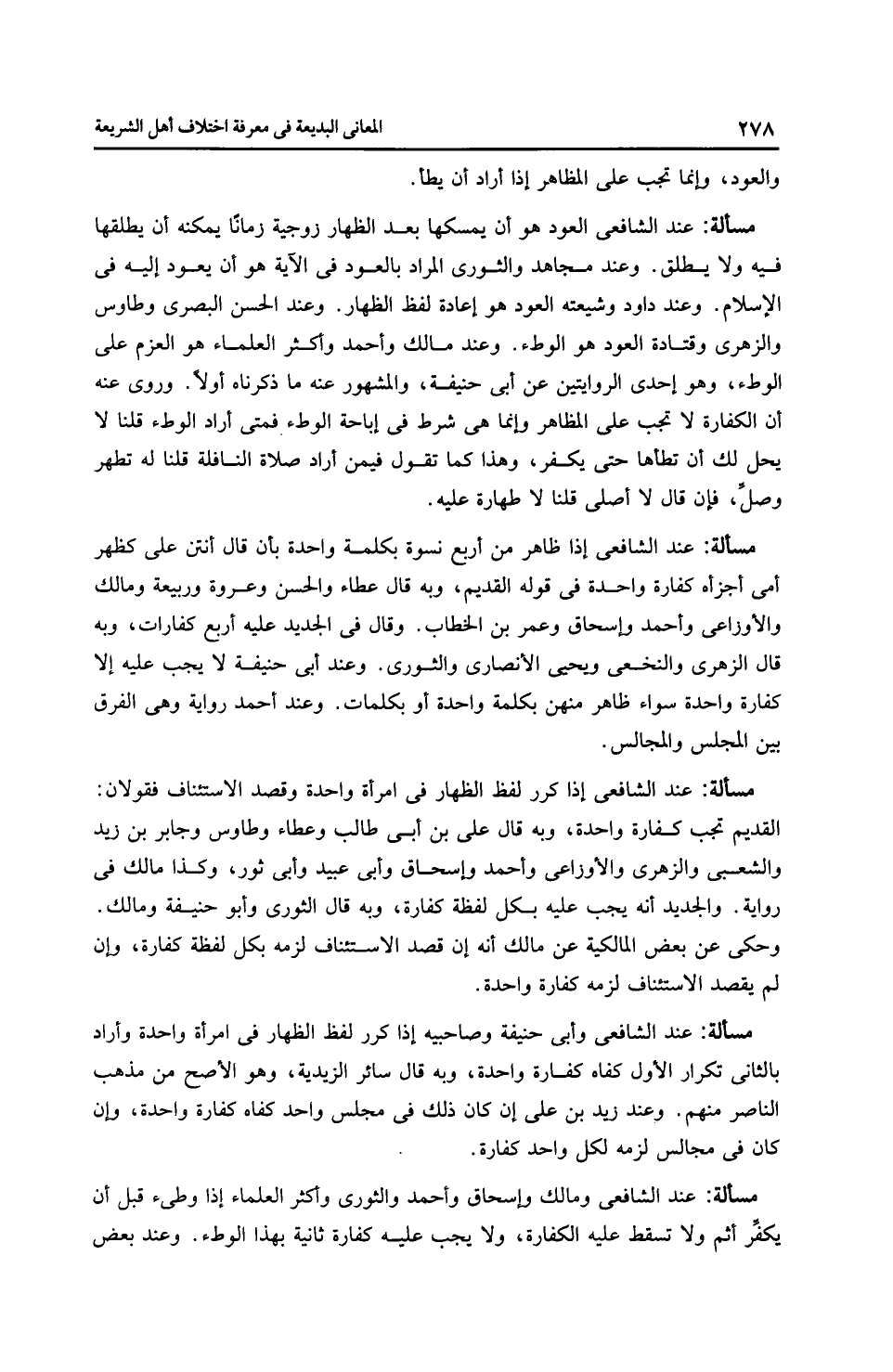 مَسْأَلَةٌ: عِنْدَ الشَّافِعِيِّ إذا ظاهر من أربع نسوة بكلمة واحدة بأن قال أنت عليَّ كظهر أمي أجزأه كفارة واحدة في قوله القديم، وبه قال عَطَاء والحسن وعروة ورَبِيعَة ومالك والْأَوْزَاعِيّ وَأَحْمَد وإِسْحَاق وعمر بن الخطاب. وقال في الجديد عليه أربع كفارات، وبه قال الزُّهْرِيّ والنَّخَعِيّ ويَحْيَى الأنصاري والثَّوْرِيّ. وعند أَبِي حَنِيفَةَ لا يجب عليه إلا كفارة واحدة سواء ظاهر منهن بكلمة واحدة أو بكلمات. وعند أَحْمَد رِوَايَة وهي الفرق بين المجلس والمجالس.
