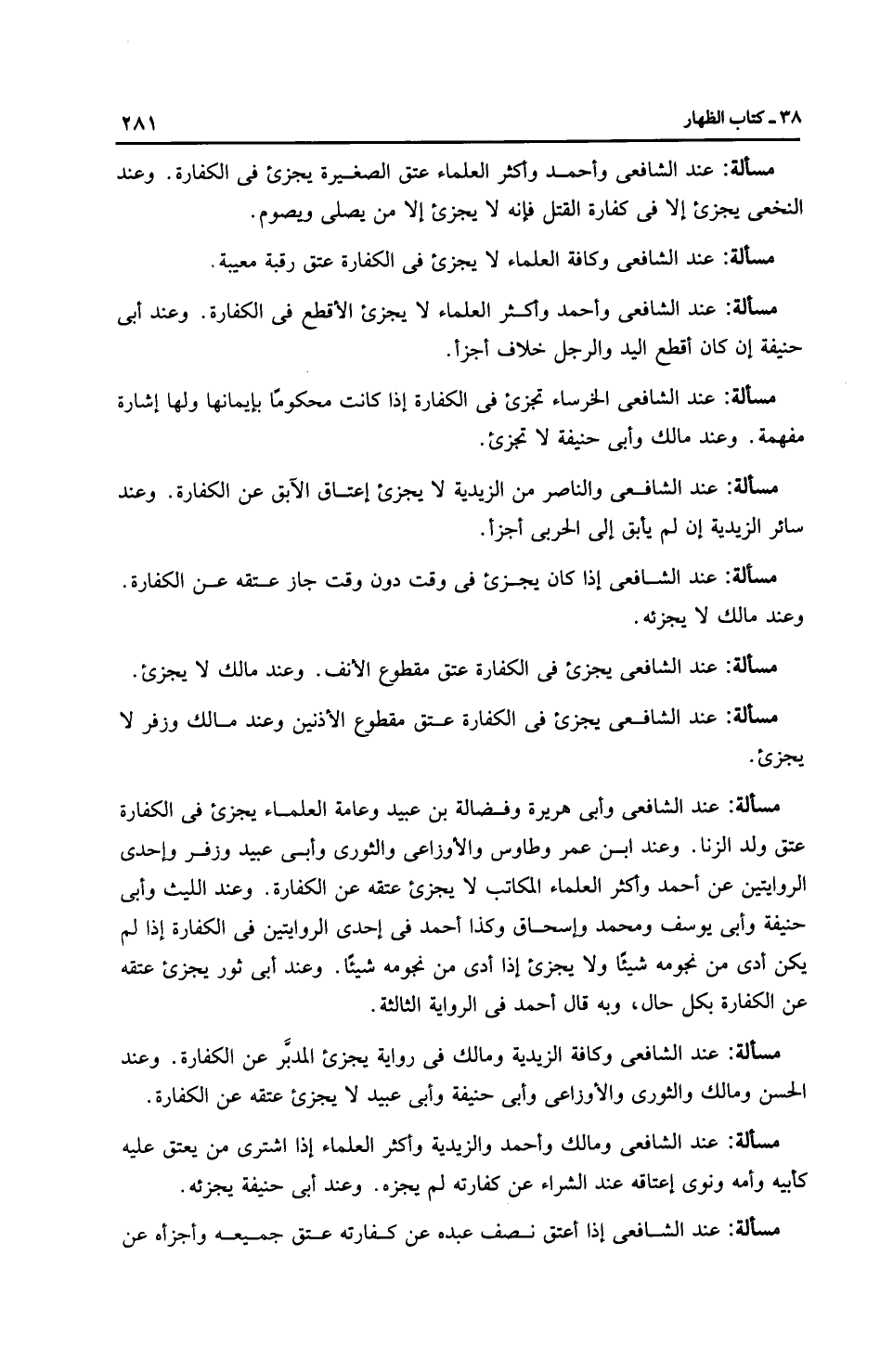 مَسْأَلَةٌ: عِنْدَ الشَّافِعِيِّ وأبي هريرة وفضالة بن عبيد وعامة العلماء يجزئ في الكفارة عتق ولد الزنا. وعند ابن عمر وطاوس والْأَوْزَاعِيّ والثَّوْرِيّ وأبي عبيد وزفر وإحدى الروايتين عن أَحْمَد وأَكْثَر الْعُلَمَاءِ المكاتب لا يجزئ عتقه عن الكفارة. وعند اللَّيْث وأبي حَنِيفَةَ وأَبِي يُوسُفَ ومُحَمَّد وإِسْحَاق وكذا أَحْمَد في إحدى الروايتين في الكفارة إذا لم يكن أدّى من نجومه شيئًا ولا يجزئ إذا أدّى من نجومه شيئًا. وعند أَبِي ثَورٍ يجزئ عتقه عن الكفارة بكل حال، وبه قال أَحْمَد في الرِوَايَة الثالثة.