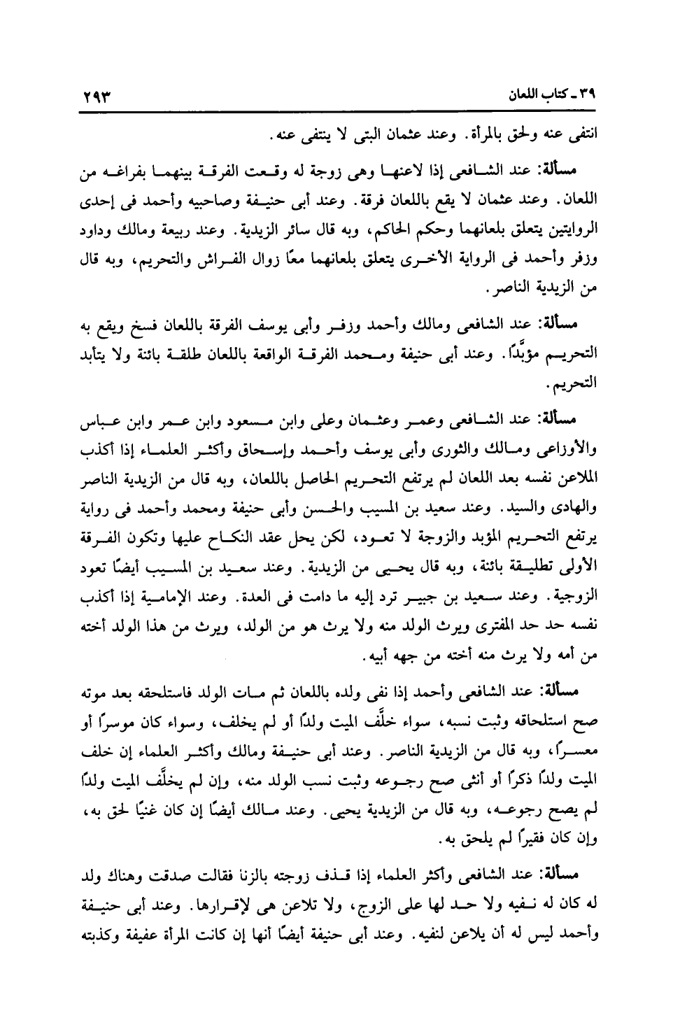 مَسْأَلَةٌ: عِنْدَ الشَّافِعِيِّ إذا لاعنها وهي زوجة له وقعت الفرقة بينهما بفراغه من اللعان. وعند عثمان لا يقع باللعان فرقة. وعند أَبِي حَنِيفَةَ وصاحبيه وَأَحْمَد في إحدى الروايتين يتعلَّق بلعانهما وحكم الحاكم، وبه قال سائر الزَّيْدِيَّة. وعند رَبِيعَة وَمَالِك وداود وزفر وَأَحْمَد في الرِوَايَة الأخرى يتعلَّق بلعانهما معًا زوال الفراش والتحريم، وبه قال من الزَّيْدِيَّة النَّاصِر.