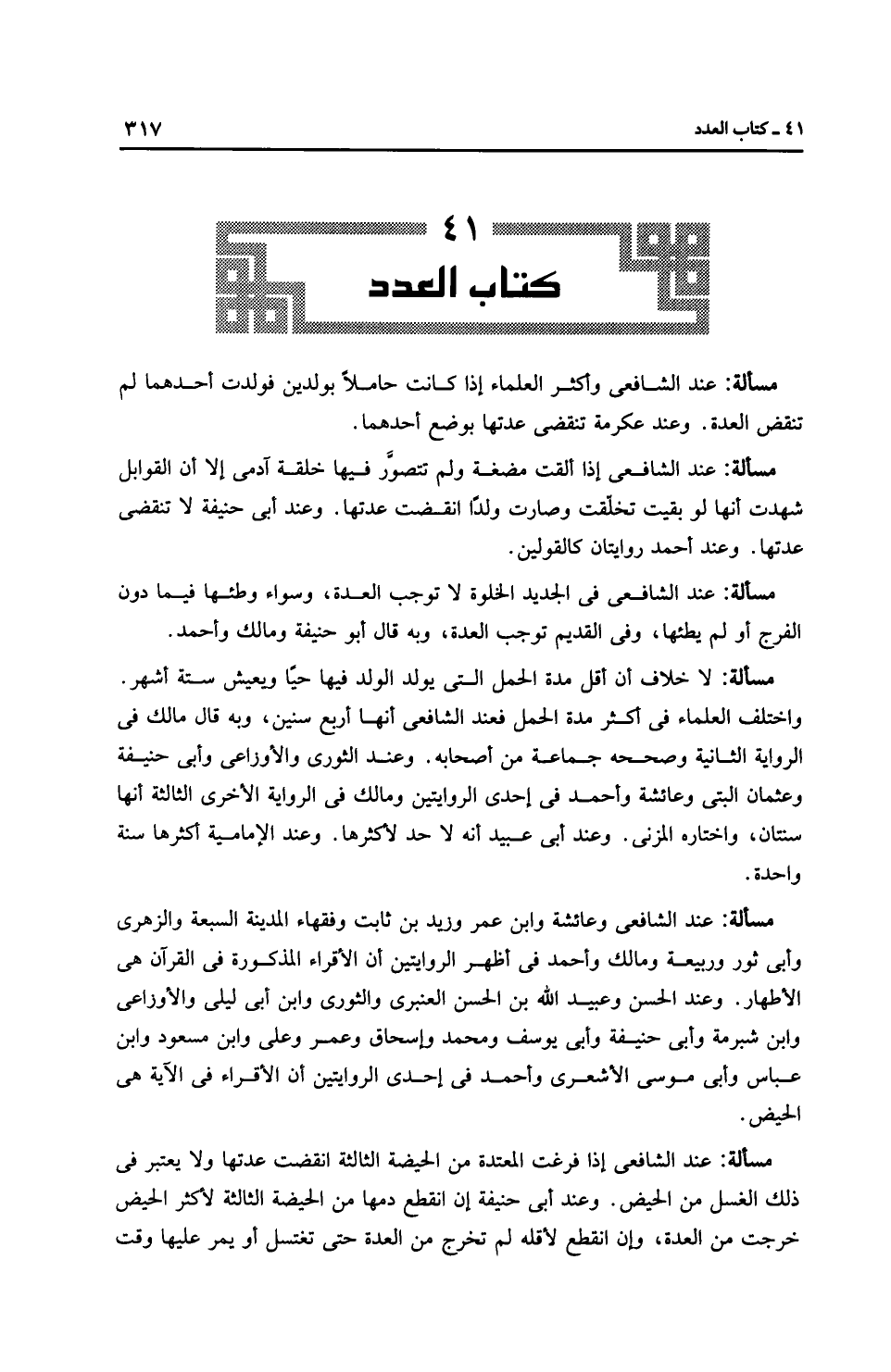 مسألة: لا خلاف أن أقل مدة الحمل التي يولد الولد فيها حيّا ويعيش ستة أشهر. واختلف العلماء في أكثر مدة الحمل فعند الشَّافِعِيّ أنها أربع سنين، وبه قال مالك في الرِوَايَة الثانية وصححه جماعة من أصحابه. وعند الثَّوْرِيّ والْأَوْزَاعِيّ وأَبِي حَنِيفَةَ وعثمان البتي وعائشة وَأَحْمَد في إحدى الروايتين وَمَالِك في الرِوَايَة الأخرى الثالثة أنها سنتان، واختاره الْمُزَنِي. وعند أبي عبيد أنه لا حد أكثرها. وعند الْإِمَامِيَّة أكثرها سنة واحدة.