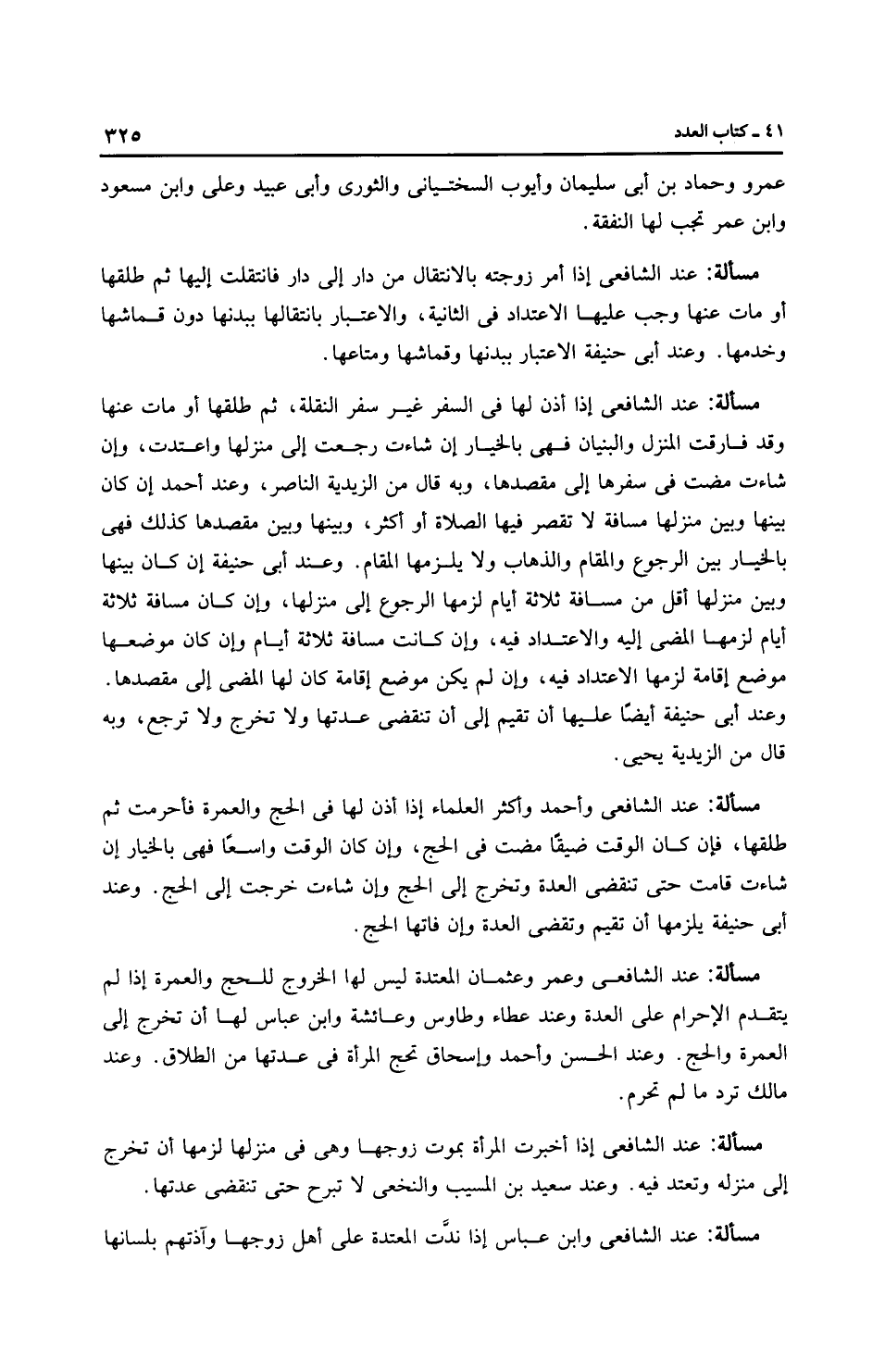 مَسْأَلَةٌ: عِنْدَ الشَّافِعِيِّ إذا أذن لها في السفر غير سفر النقلة، ثم طلقها أو مات عنها وقد فارقت المنزل والبنيان فهي بالخيار إن شاءت رجعت إلى منزلها واعتدت، وإن شاءت مضت في سفرها إلى مقصدها، وبه قال من الزَّيْدِيَّة النَّاصِر، وعند أَحْمَد إن كان بينها وبين منزلها مسافة لا تقصر فيها الصلاة أو أكثر، وبينها وبين مقصدها كذلك فهي بالخيار بين الرجوع والمقام والذهاب ولا يلزمها المقام. وعند أَبِي حَنِيفَةَ إن كان بينها وبين منزلها أقل من مسافة ثلاثة أيام لزمها الرجوع إلى منزلها، وإن كان مسافة ثلاثة أيام لزمها المضي إليه والاعتداد فيه، وإن كانت مسافة ثلاثة أيام وإن كان موضعها موضع إقامة لزمها الاعتداد فيه، وإن لم يكن موضع إقامة كان لها المضي إلى مقصدها. وعند أَبِي حَنِيفَةَ أيضًا عليها أن تقيم إلى أن تنقضي عدتها ولا تخرج ولا ترجع، وبه قال من الزَّيْدِيَّة يَحْيَى.