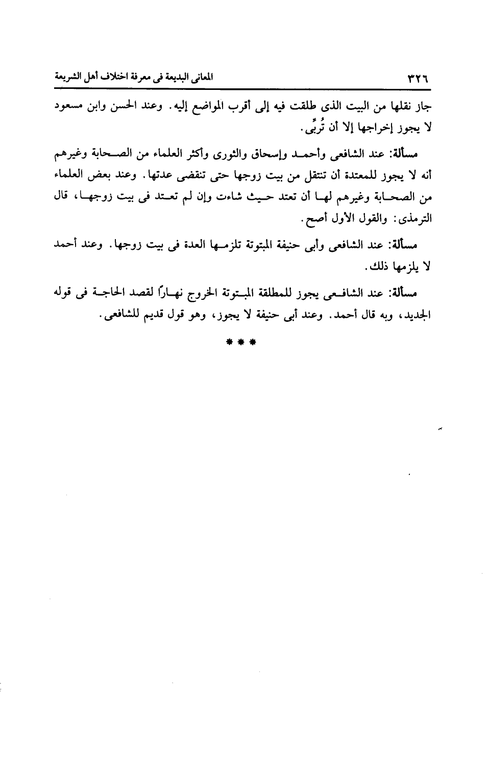 مَسْأَلَةٌ: عِنْدَ الشَّافِعِيِّ وَأَحْمَدَ وإِسْحَاق والثَّوْرِيّ وأَكْثَر الْعُلَمَاءِ من الصحابة وغيرهم أنه لا يجوز للمعتدة أن تنتقل من بيت زوجها حتى تنقضي عدتها. وعند بعض العلماء من الصحابة وغيرهم لها أن تعتد حيث شاءت وإن لم تعتد في بيت زوجها، قال الترمذي: والقول الأول أصح.