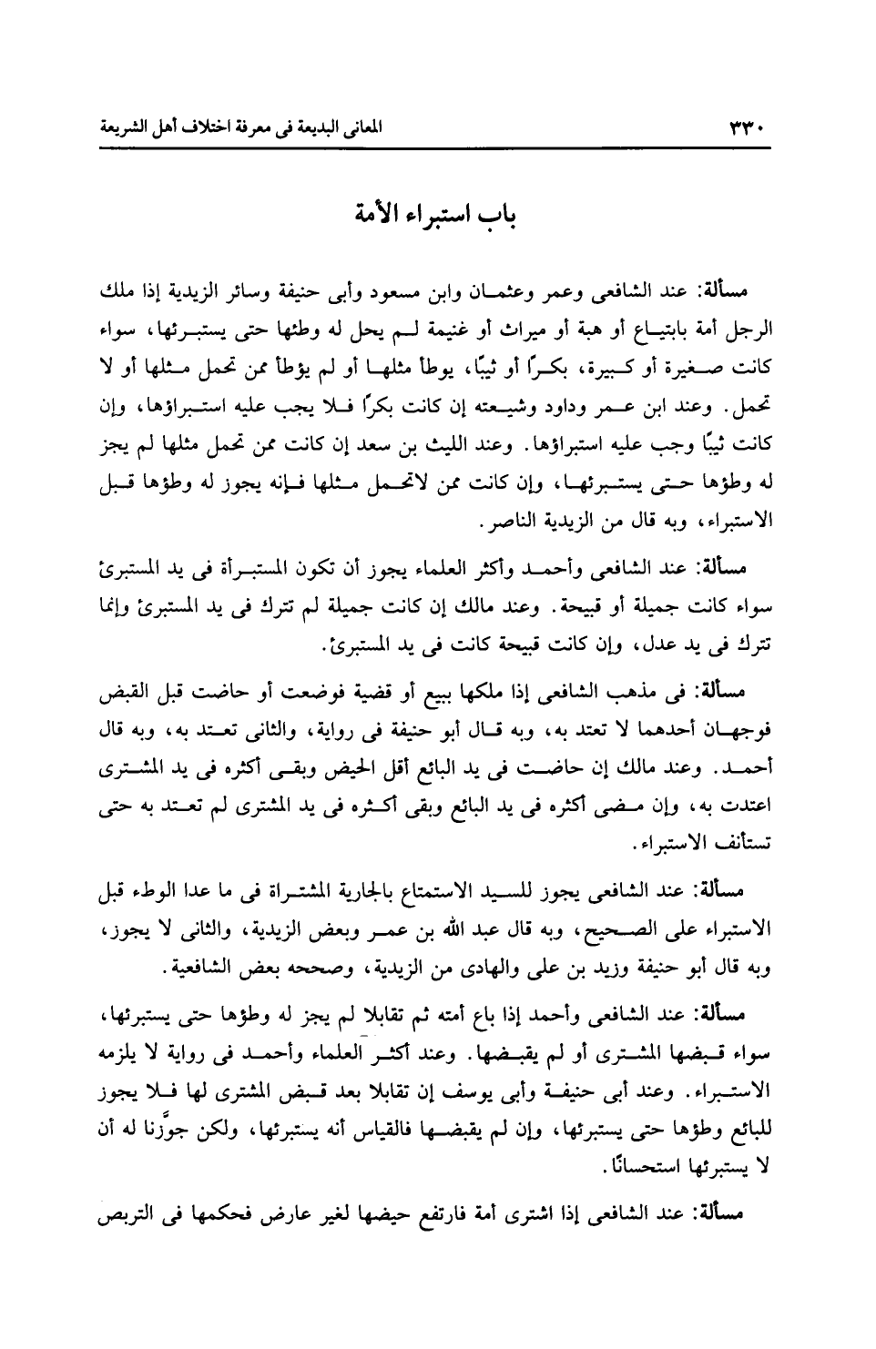 مَسْأَلَةٌ: عِنْدَ الشَّافِعِيِّ وعمر وعثمان وابن مسعود وأَبِي حَنِيفَةَ وسائر الزَّيْدِيَّة إذا ملك الرجل أمة بابتياع أو هبة أو ميراث أو غنيمة لم يحل له وطئها حتى يستبرئها، سواء كانت صغيرة أو كبيرة، بكرًا أو ثيبًا، يوطأ مثلها أو لم يؤطأ ممن تحمل مثلها أو لا تحمل. وعند ابن عمر وداود وشيعته إن كانت بكرًا فلا يجب عليه استبراؤها، وإن كانت ثيبًا وجب عليه استبراؤها. وعند اللَّيْث بن سعد إن كانت ممن تحمل مثلها لم يجز له وطؤها حتى يستبرئها، وإن كانت ممن لا تحمل مثلها فإنه يجوز له وطؤها قبل الاستبراء، وبه قال من الزَّيْدِيَّة النَّاصِر.