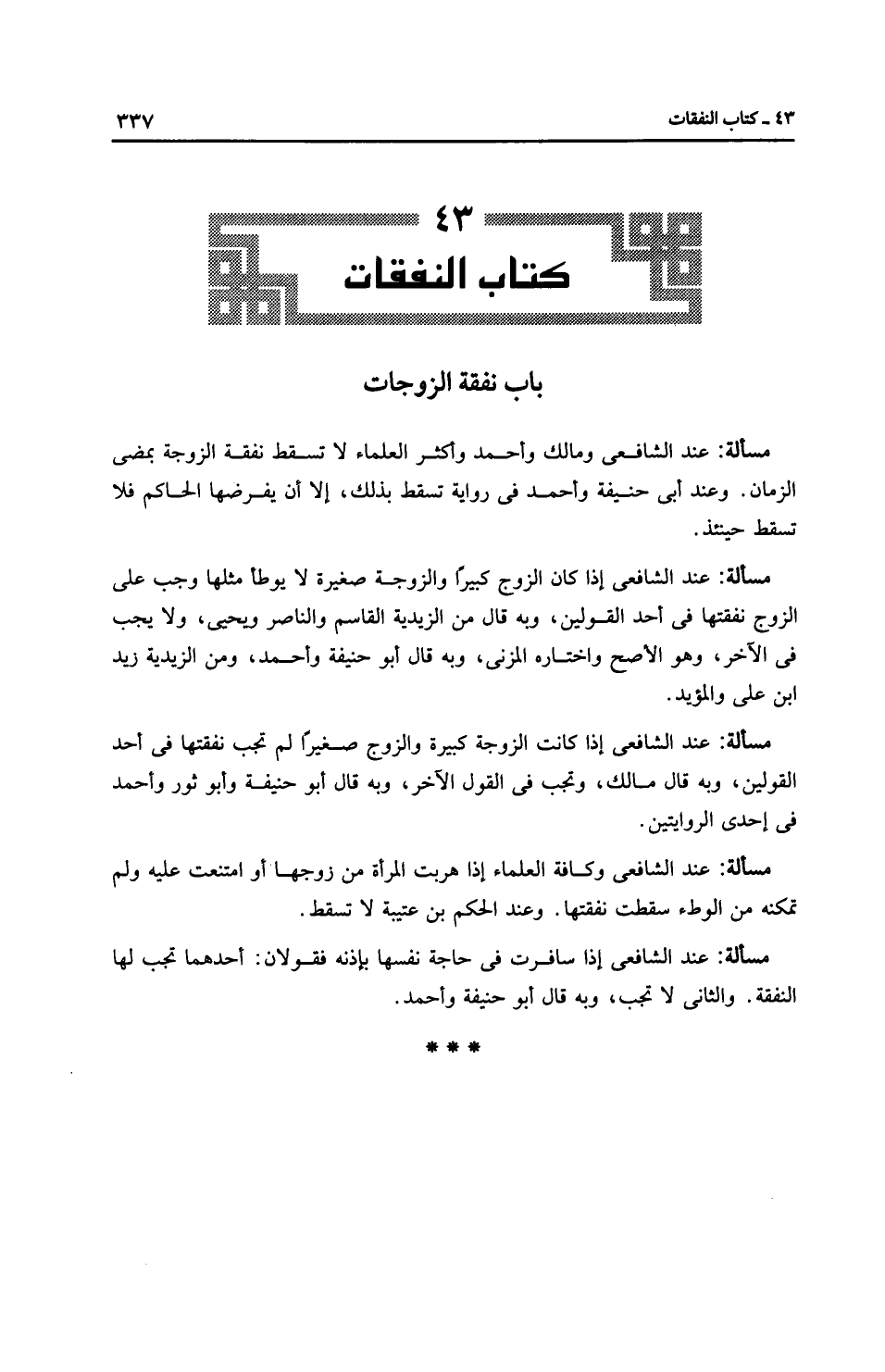مَسْأَلَةٌ: عِنْدَ الشَّافِعِيِّ وَمَالِك وَأَحْمَد وأَكْثَر الْعُلَمَاءِ لا تسقط نفقة الزوجة بمضى الزمان. وعند أَبِي حَنِيفَةَ وَأَحْمَد في رِوَايَة تسقط بذلك، إلا أن يفرضها الحاكم فلا تسقط حينئذٍ.