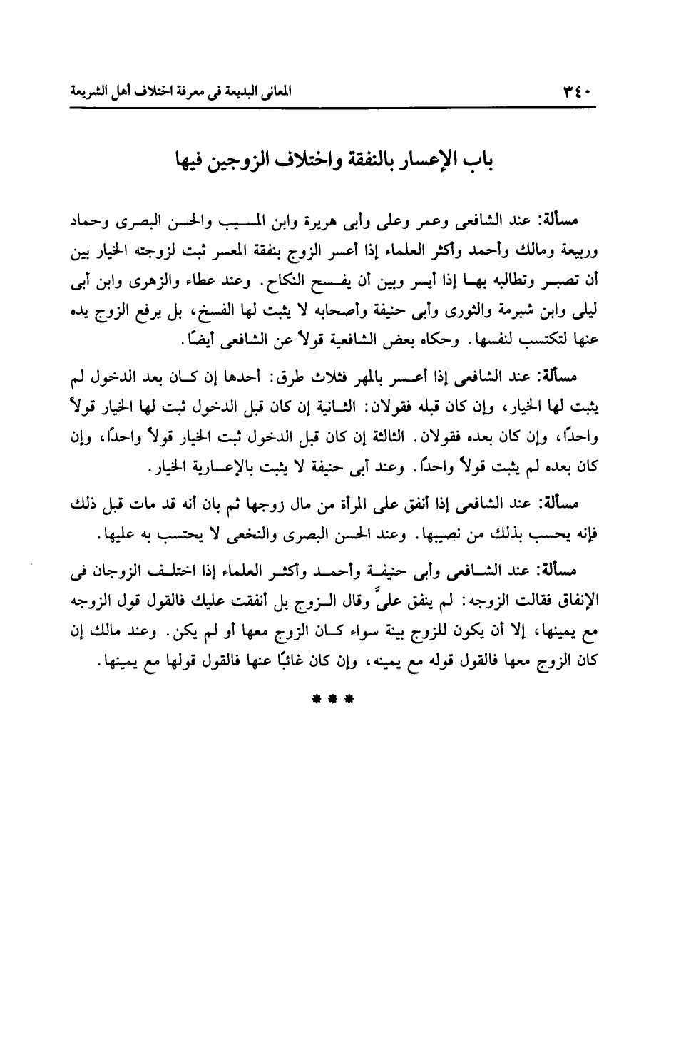 مَسْأَلَةٌ: عِنْدَ الشَّافِعِيِّ وعمر وعلي وأبي هريرة وابن المسيب والحسن البصري وحماد ورَبِيعَة وَمَالِك وَأَحْمَد وأَكْثَر الْعُلَمَاءِ إذا أعسر الزوج بنفقة المعسر ثبت لزوجته الخيار بين أن تصبر وتطالبه بها إذا أيسر وبين أن يفسح النكاح. وعند عَطَاء والزُّهْرِيّ وابن أبي ليلى وابن شُبْرُمَةَ والثَّوْرِيّ وأَبِي حَنِيفَةَ وأصحابه لا يثبت لها الفسخ، بل يرفع الزوج يده عنها لتكتسب لنفسها. وحكاه بعض الشَّافِعِيَّة قولاً عن الشَّافِعِيّ أيضًا.