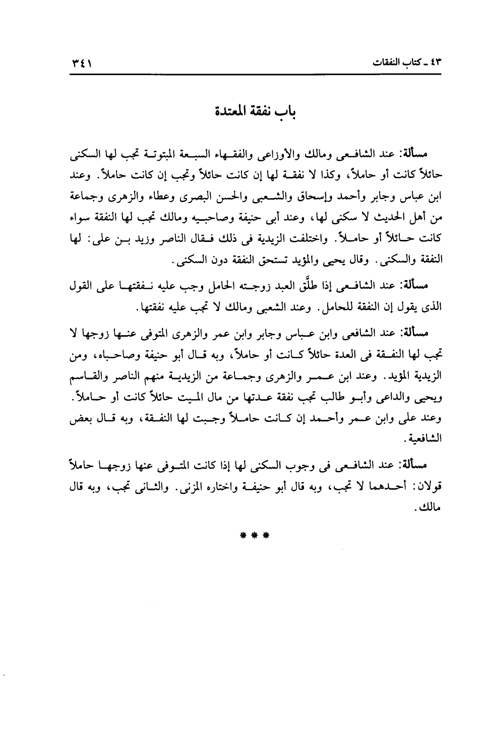 مَسْأَلَةٌ: عِنْدَ الشَّافِعِيِّ وابن عَبَّاسٍ وجابر وابن عمر والزُّهْرِيّ المتوفى عنها زوجها لا تجب لها النفقة في العدة حائلاً كانت أو حاملاً، وبه قال أبو حَنِيفَةَ وصاحباه، ومن الزَّيْدِيَّة المؤيَّد. وعند ابن عمر والزُّهْرِيّ وجماعة من الزَّيْدِيَّة منهم النَّاصِر والقاسم ويَحْيَى والداعي وأبو طالب تجب نفقة عدتها من مال الميت حائلاً كانت أو حاملاً. وعند علي وابن عمر وَأَحْمَد إن كانت حاملاً وجبت لها النفقة، وبه قال بعض الشَّافِعِيَّة.