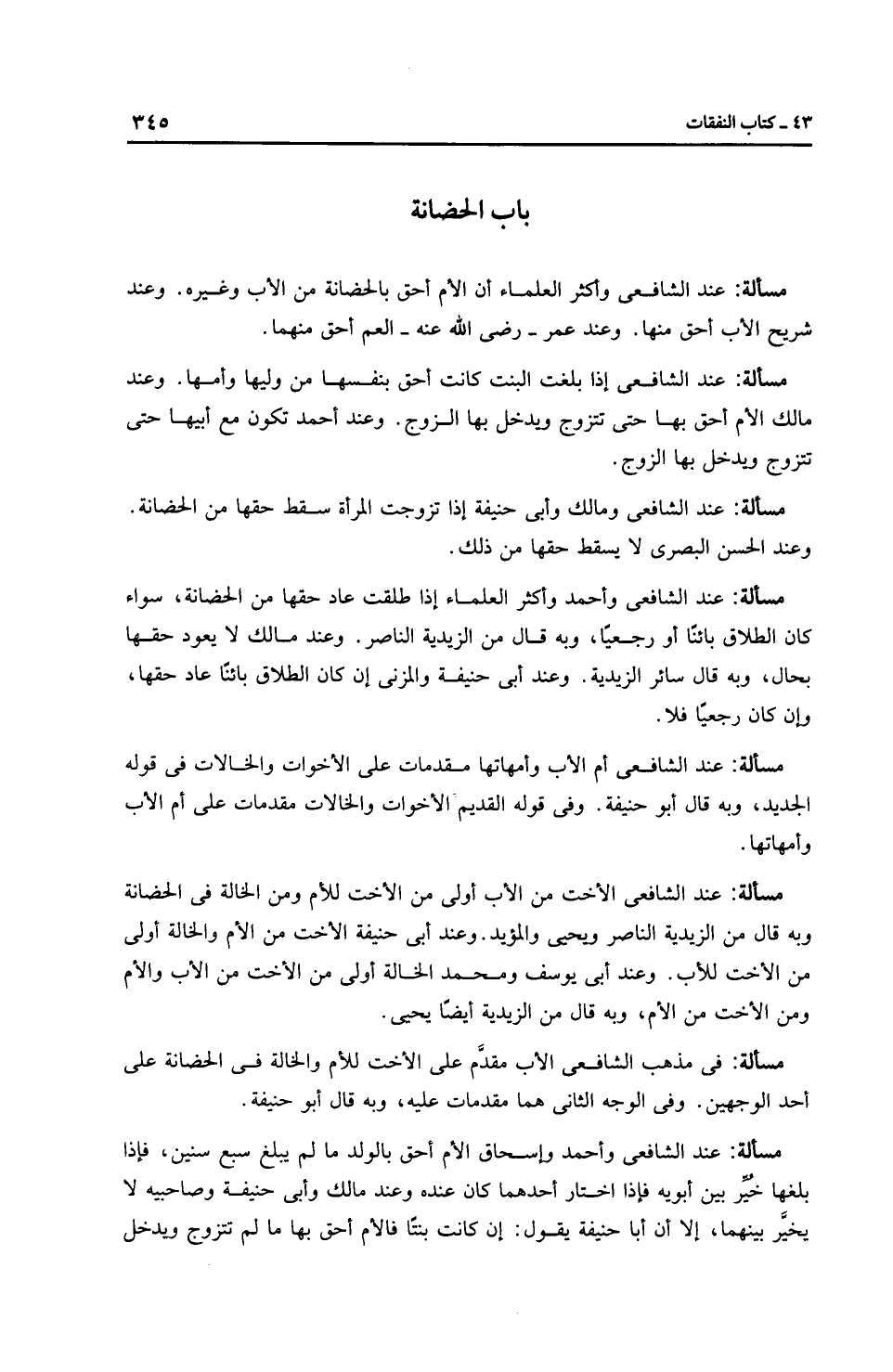مَسْأَلَةٌ: عِنْدَ الشَّافِعِيِّ وأَكْثَر الْعُلَمَاءِ أن الأم أحق بالحضانة من الأب وغيره. وعند شريح الأب أحق منها. وعند عمر - رضي الله عنه - العم أحق منهما.