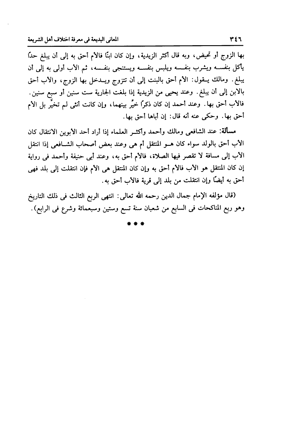 (قال مؤلفه الإمام جمال الدين رحمه الله تعالى: انتهى الربع الثالث في ذلك التاريخ وهو ربع المناكحات في السابع من شعبان سنة تسع وستين وسبعمائة وشرع في الرابع).